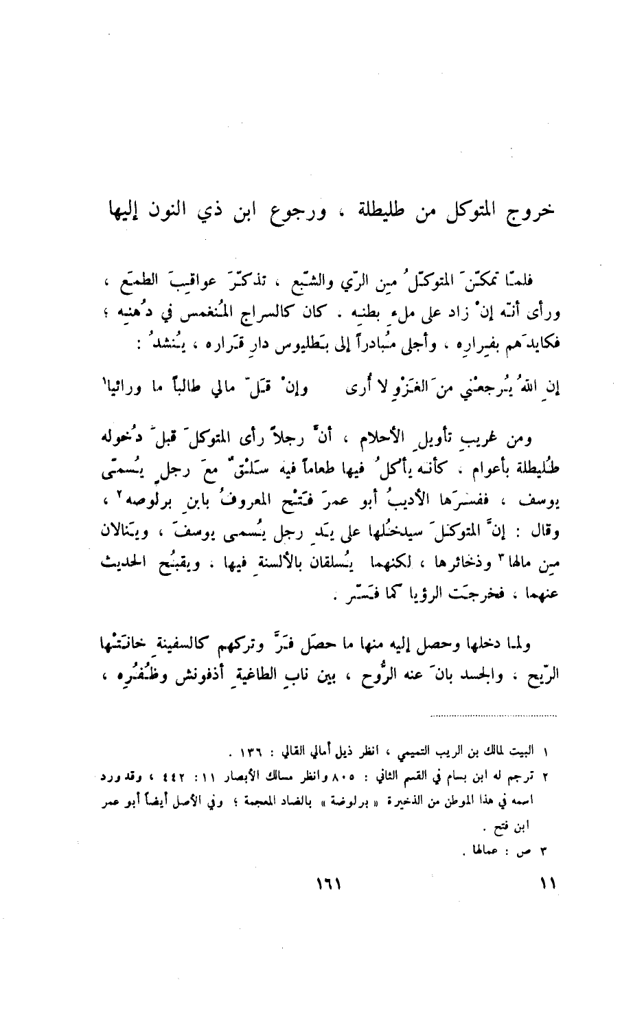 إن الله يرجعني من الغزو ولا أرى ... وإن قل مالي طالباً ما ورائيا ومن غريب تأويل الأحلام، أن رجلاً رأى المتوكل قبل دخوله طليطلة بأعوام، كأنه يأكل فيها طعاماً فيه سلق مع رجلٍ يسمى يوسف، ففسرها الأديب أبو عمر فتح المعروف بابن برلوصة، وقال: إن المتوكل سيدخلها على يد رجل يسمى يوسف، وينالان من مالها وذخائرها، لكنهما يسلقان بالألسنة فيها. ويقبح الحديث عنهما، فخرجت الرؤيا كما فسر.