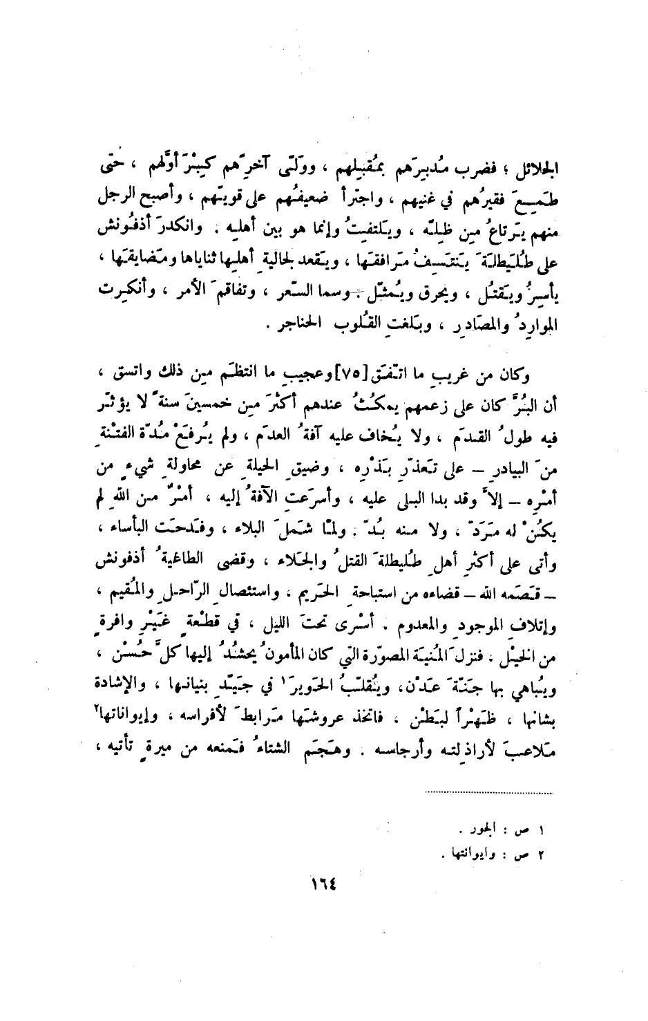 وكان من غريب ما اتفق [75] وعجيب ما انتظم من ذلك واتسق، أن البر كان على زعمهم يمكث عندهم من خمسين سنة لا يؤثر فيه طول القدم، ولا يخاف عليه آفة العدم، ولم يرفع مدة الفتنة من البيادر - على تعذر بذره، وضيق الحيلة من محاولة شيء من أمره - إلا وقد بدا البلى عليه، وأسرعت الآفة إليه، أمر من الله لم يكن له مرد. ولا منه بد. ولما شمل البلاء، وفدحت البأساء، وأتى على أكثر أهل طليطلة القتل والجلاء، وقضى الطاغية أذفنوش - قصمه الله - قضاءه من استباحة الحريم، واستئصال الراحل والمقيم، وإتلاف الموجود والمعدوم، أسرى تحت الليل، في قطعة غير وافرة من الخيل، فنزل المنية المصورة التي كان المأمون يحشد إليها كل حسن، ويباهي بها جنة عدن، ويقلب الحوير في جيد بنيانها، والإشادة بشانها، ظهرا لبطن. فاتخذ عروشها مرابط لأفراسه، وإيواناتها ملاعب لأراذلته وأرجاسه. وهجم الشتاء فمنعه من ميرة تأتيه