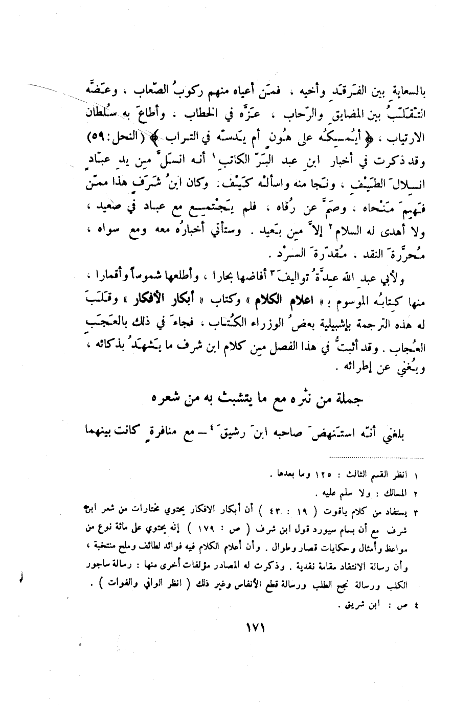 بالسعاية بين الفرقد وأخيه، فمن أعياد منهم ركوب الصعاب، وعضه التقلب بين المضايق والرحاب، عزه في الخطاب، وأطاع به سلطان الارتياب. {أيمسكه على هون أم يدسه في التراب} (النحل: 59) وقد ذكرت في أخبار ابن عبد البر الكاتب أنه انسل من يد عباد انسلال الطيف، ونجا منه واسأله كيف. وكان ابن شرف هذا ممن فهم منحاه، وصم عن رقاه، فلم يجتمع مع عباد في صعيد، ولا أهدى له السلام إلا من بعيد. وستأتي أخباره معه ومع سواه، محررة النقد، مقدرة السرد.