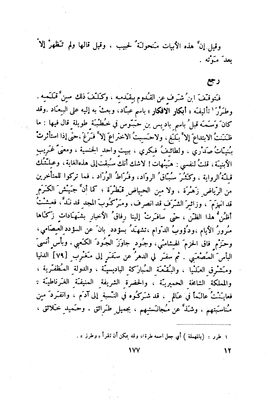 فتوقف ابن شرف عن القدوم بقدمه، وكلف ذلك سن قلمه وطرر تأليفه " أبكار الأفكار " باسم عباد، وبعث به إليه على العباد. وقد كان وسمه قبل باسم باديس بن حبوس في خطبة طويلة قال فيها: ما ظننت الابتداع إلا بلغ، ولا حسبت الاختراع إلا فرغ، حتى إذا استأثرت بنيات صدري، ولطائف فكري، ببيت واحد الجنسية، ومعنى غريب الأبنية، قلت لنفسي: هيهات! لاشك أنك سبقت إلى هذه الغاية، وعلتك قلة الرواية، وكثر سباق الرواد، وفراط الوراد، فما تركوا للمتأخرين من الرياض زهرة، ولا من الحياض قطرة؛ كما أن جيش الكرم قد انهزم، وزائر الشرف قد انصرف، ومركوب المجد قد ند، فعشت أظن هذا الظن، حتى سافرت إلينا رفاق الأخبار بشهادات زكاها مرور الأيام، ودؤوب الدوام، تشهد بسؤدد بان عن السؤدد العصامي، وحزم فاق الحزم الهشامي، وجود جاوز الجود الكعبي، وبأس أنسى البأس المصعبي. ثم سفر لي الدهر عن سفر إلى مغرب [79] الدنيا ومشرق العليا، والبقعة المباركة الباديسية، والدولة المظفرية، والمملكة الشامخة الحميرية، والحضرة الشريفة المنيفة الغرناطية، فعاينت عالماً في عالم، قد شركوه في النسبة إلى آدم، وانفرد من مناسبتهم، وشذ عن مجانستهم، بجميل طرائق، وحميد خلائق