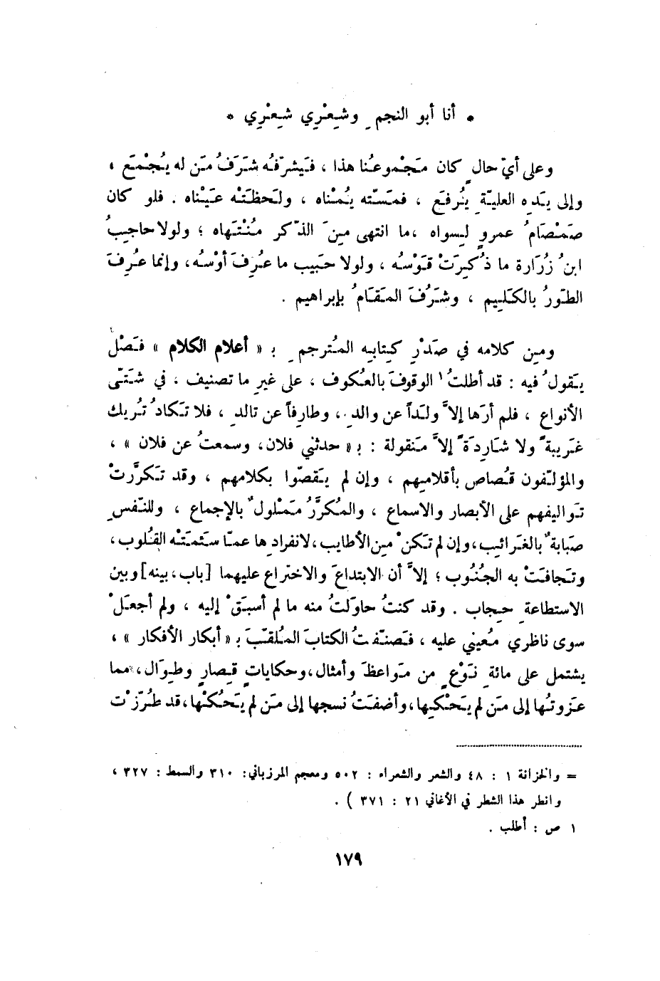 أبا أبو النجم وشعري شعري ... وعلى أي حال كان مجموعنا هذا، فيشرفه شرف من له يجمع، وإلى يده العلية يرفع، فمسته يمناه، ولحظته عيناه. فلو كان صمصام عمرو لسواه، ما انتهى من الذكر منتهاه؛ ولولا حاجب ابن زرارة ما ذكرت قوسه، ولولا حبيب ما عرف أوسه، وإنما عرف الطور بالكليم، وشرف المقام بإبراهيم.