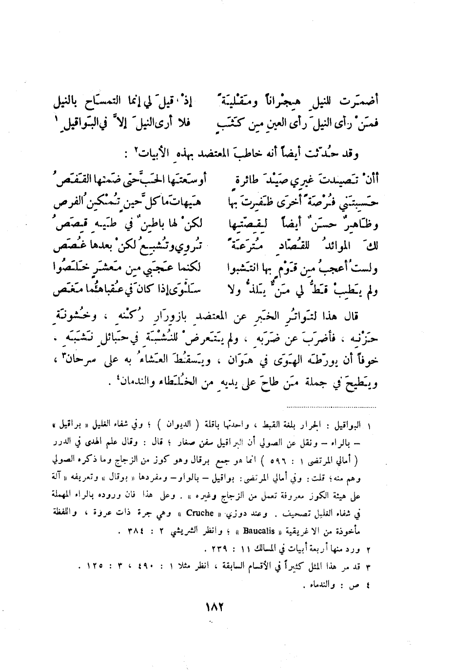 ولم يطب قط لي من يلذ ولا ... سلوى إذا كان في عقباهما مغص قال هذا لتواتر الخبر عن المعتضد بازورار ركنه، وخشونة حزنه، فأضرب عن ضربه، ولم يتعرض للنشبة في حبائل نشبه، خوفاً أن يورطه الهوى في هوان، ويسقط العشاء به على سرحان، ويطيح في جملة من طاح على يديه من الخلطاء والندمان.