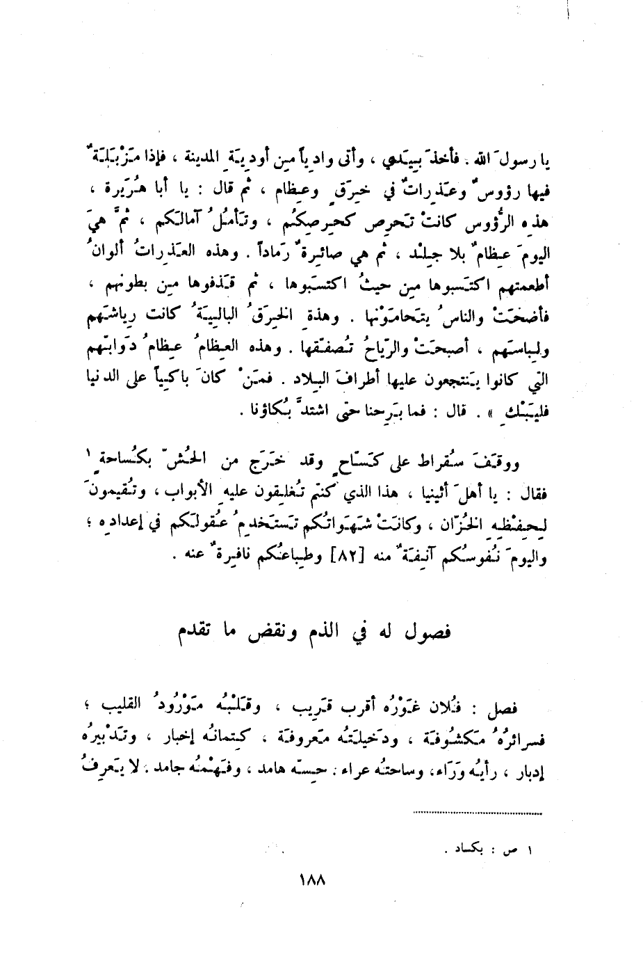 ووقف سقراط على كساح وقد خرج من الحش بكساحة فقال: يا أهل أثينا، هذا الذي كنتم تغلقون عليه الأبواب، وتقيمون لحفظه الخزان، وكانت شهواتكم تستخدم عقولكم في إعداده؛ واليوم نفوسكم آنفة منه [82] وطباعكم نافرة عنه.