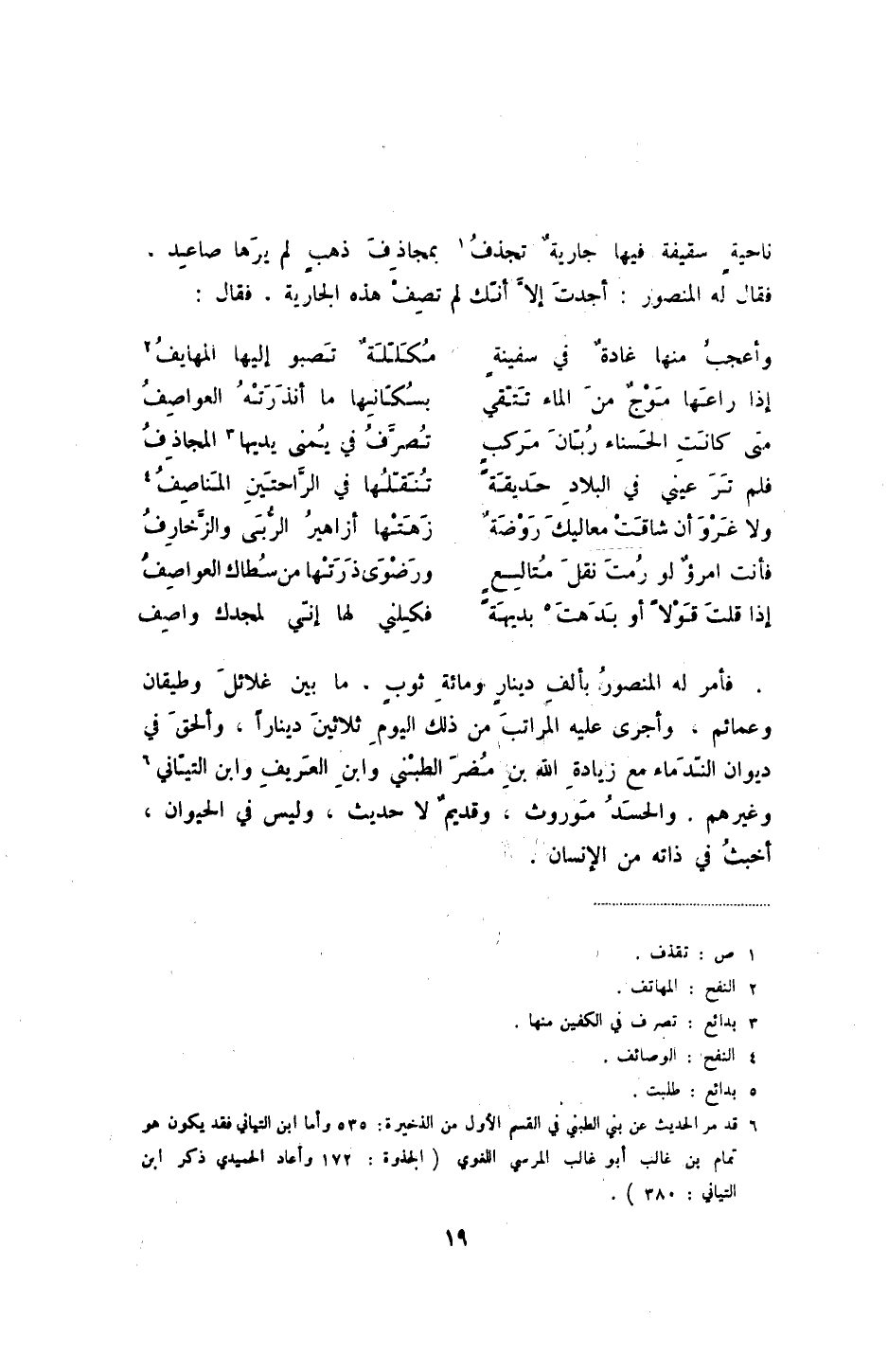 إذ قلت قولا أو بدهت بديهة ... فكلني لها أني لمجدك واصف فأمر له المنصور بألف دينار ومائة ثوب، ما بين غلائل وطيقان وعمائم، وأجرى عليه المراتب من ذلك اليوم ثلاثين دينار، وألحق في ديوان الندماء مع زيادة الله بن مضر الطبني وأبن العريف وأبن التياني وغيرهم. والحسد موروث، وقديم لا حديث، وليس في الحيوان، أخبث في ذاته من الإنسان.