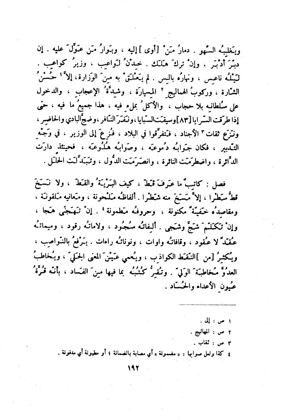 فصل: كاتب ما عرف قط، كيف البرية والقط، ولا نسخ قط سطراً، إلا مسخ منه شطراً. ألفاظه ملحونة، ومعانيه ملقونة، ومقاصده خفية مكنونة، وحروفه مطمونة. إن تهجني هجا، وإن تكلم شج وشجى. ألفاته سجود، ولاماته رقود، وميماته عقد لا عقود، وقافاته واوات، ونوناته راءات. يرفع بالنواصب، ويكثر [من] النقط الكواذب، ويعمي عين المعنى الجلي، ويخاطب العدو مخاطبة الولي. وتقر كتبه بما فيها من الفساد، بأنه قرة عيون الأعداء والحساد.