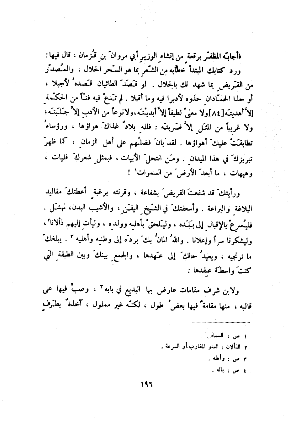 ورد كتابك المبتدأ خطابه من الشعر بما هو السحر الحلال، والمصدر من القريض بما شعد لك بالجلال. ولو قصد الطائيان قصده لأجبلا، أو حذا الحمادان حذوه لدبرا فيه وما أقبلا. لم تدع فيه فناً من الحكمة إلا أهديته [84] ولا معنى لطيفاً إلا أبديته، ولا نوعاً من الأدب إلا جلبته؛ ولا غريباً من المثل إلا ضربته: فلله بلاد غذاك هواؤها، ورؤساء تطابقت عليك أهواؤها. لقد بان فضلهم على أهل الزمان، كما ظهر تبريزك في هذا الميدان. ومن انتحل الأبيات، فبمثل شعرك فليات، وهيهات، ما أبعد الأرض من السموات!