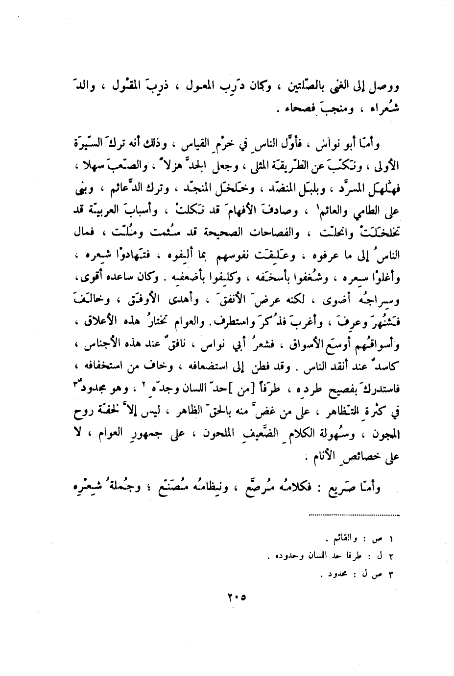 وأما أبو نواس، فأول الناس في خرم القياس، وذلك أنه ترك السيرة الأولى، ونكب عن الظطريقة المثلى، وجعل الجد هزلاً، والصعب سهلا، فهلهل المسرد، وبلبل المنضد، وخلخل المنجد، وترك الدعائم، وبنى على الطامي والعائم، وصادف الأفهام قد نكلت، وأسباب العربية قد تخلخلت وانحلت، والفصاحات الصحيحة قد سئمت وملت، فمال الناس إلى ما عرفوه، وعلقت نفوسهم بما ألفوه، فتهادوا شعره. وأغلوا سعره، وشغفوا بأسخفه، وكلفوا بأضعفه. وكان ساعده أقوى، وسراجه أضوى، لكنه عرض الأنفق، وأهدى الأوفق، وخالف فشهر وعرف، وأغرب فذكر واستطرف. والعوام تختار هذه الأعلاق، وأسواقهم أوسع الأسواق، فشعر أبي نواس، نافق عند هذه الأدجناس، كاسد عند أنقد الناس. وقد فطن إلى استضعافه، وخاف من استخفافه، فاستدرك بفصيح طرده، طرفاً [من] حد اللسان وجده، وهو مجدود في كثرة التظاهر، على من غض منه بالحق الظاهر، ليس إلا لخفة روح المجون، وسهولة الكلام الضعيف الملحون، على جمهور العوام، لا على خصائص الأنام.