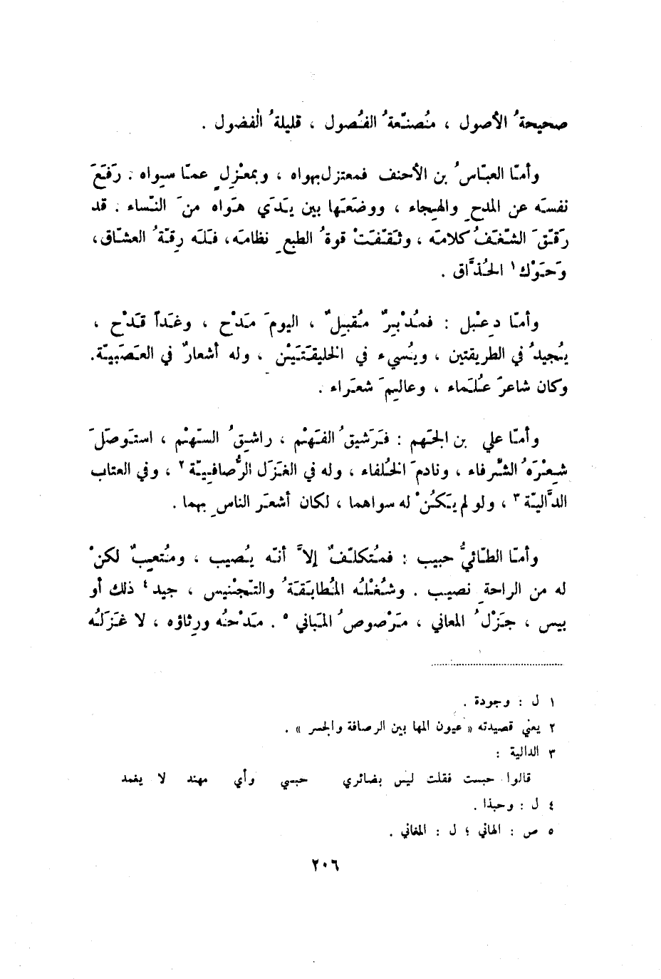 وأما الطائي حبيب: فمتكلف إلا أنه يصيب، ومتعب لكن له من الراحة نصيب، وشغله المطابقة والتجنيس، جيد ذلك أو ببس، جزل المعاني، مرصوص المباني. مدحه ورثاؤه، لا غزله