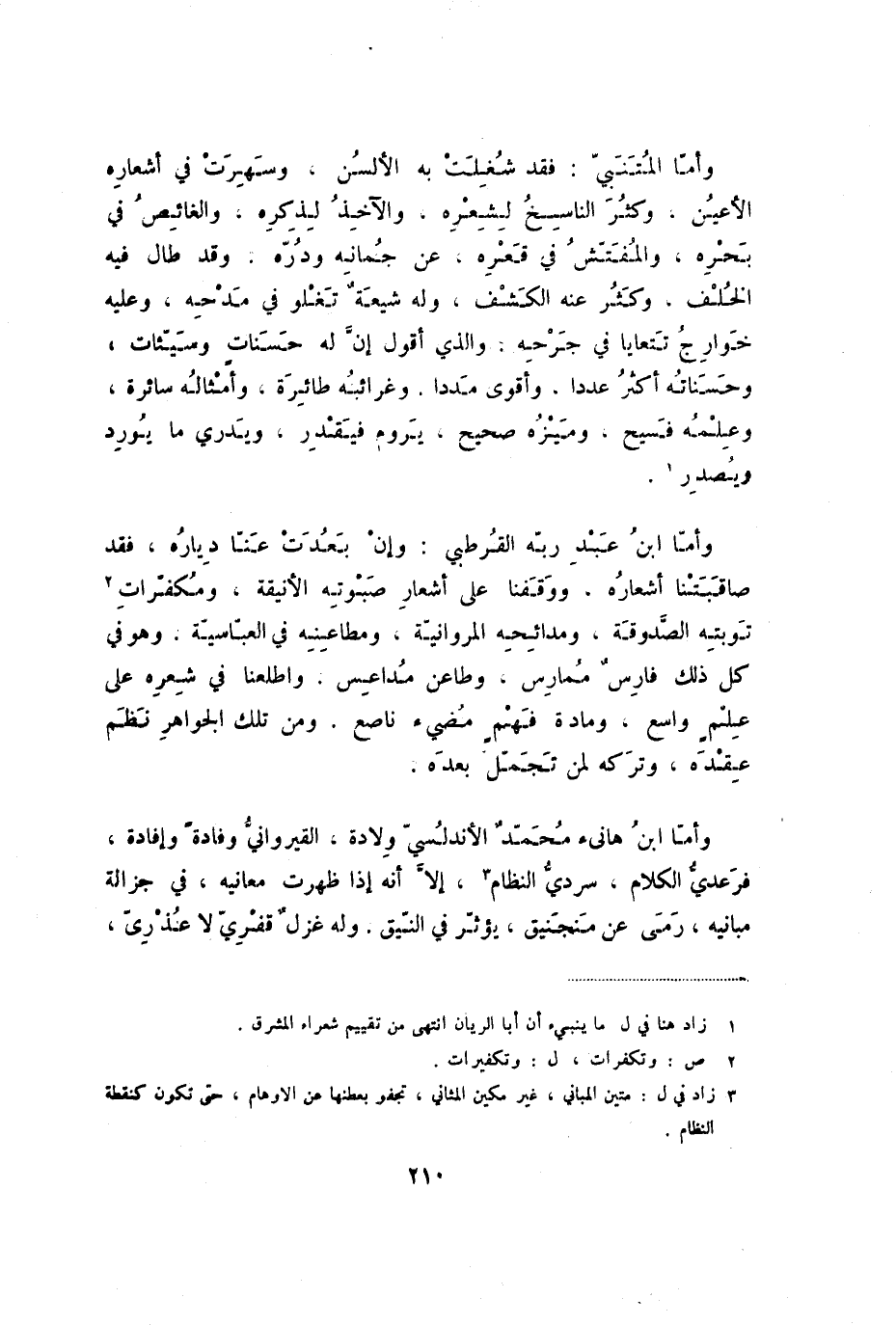وأما المتنبي: فقد شغلت به الألسن. وسهرت في أشعاره الأعين. وكثر الناسخ لشعره. وألآخذ لذكره، والغائص في بحره، والمفتش في قعره. عن جمانه ودرن. وقد طال فيه الخلف، وكثر عنه الكشف. وله شيعة تغلو في مدحه، وعليه خوارج تتعايا في جرحه. والذي أقول إن له حسنات وسيئات، وحسناته أكثر عددا، وأقوى مددا، وغرائبه طائرة، وأمثاله سائرة، وعلمه فسيح، وميزه صحيح، يروم فيقدر، ويدري ما يورد ويصدر.