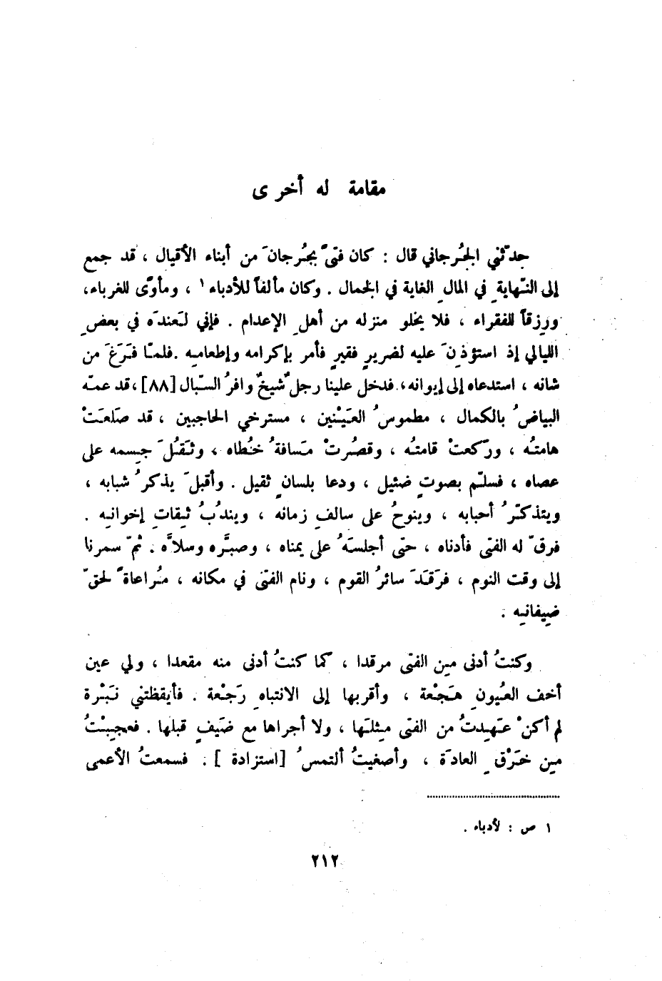 حدثني الجرجاني قال: كان فتى بجرجان من أبناء الأقيال، قد جمع إلى النهاية في المال الغاية في الجمال. وكان مألفاً للأدباء، ومأوى للغرباء، ورزقاً للفقراء، فلا يخلو منزله من أهل الإعدام. فإني لعنده في بعض الليالي إذ استؤذن عليه لضرير فقير فأمر بإكرامه وإطعامه. فلما فرغ من شانه، استدعاه إلى إيوانه، فدخل علينا رجل شيخ وافر السبال [88] ، قد عمه البياض بالكمال، مطموس العينين، مسترخي الحاجبين، قد صلعت هامته، وركعت قامته، وقصرت مسافة خطاه، وثقل جسمه على عصاه، فسلم بصوت ضئيل، ودعا بلسان ثقيل. وأقبل يذكر شبابه، ويتذكر أحبابه، وينوح على سالف زمانه، ويندب ثقات إخوانه. فرق له الفتى فأدناه، حتى أجلسه على يمناه، وصبره وسلاه. ثم سمرنا إلى وقت النوم، فرقد سائر القوم، ونام الفتى في مكانه، مراعاة لحق ضيفانه.