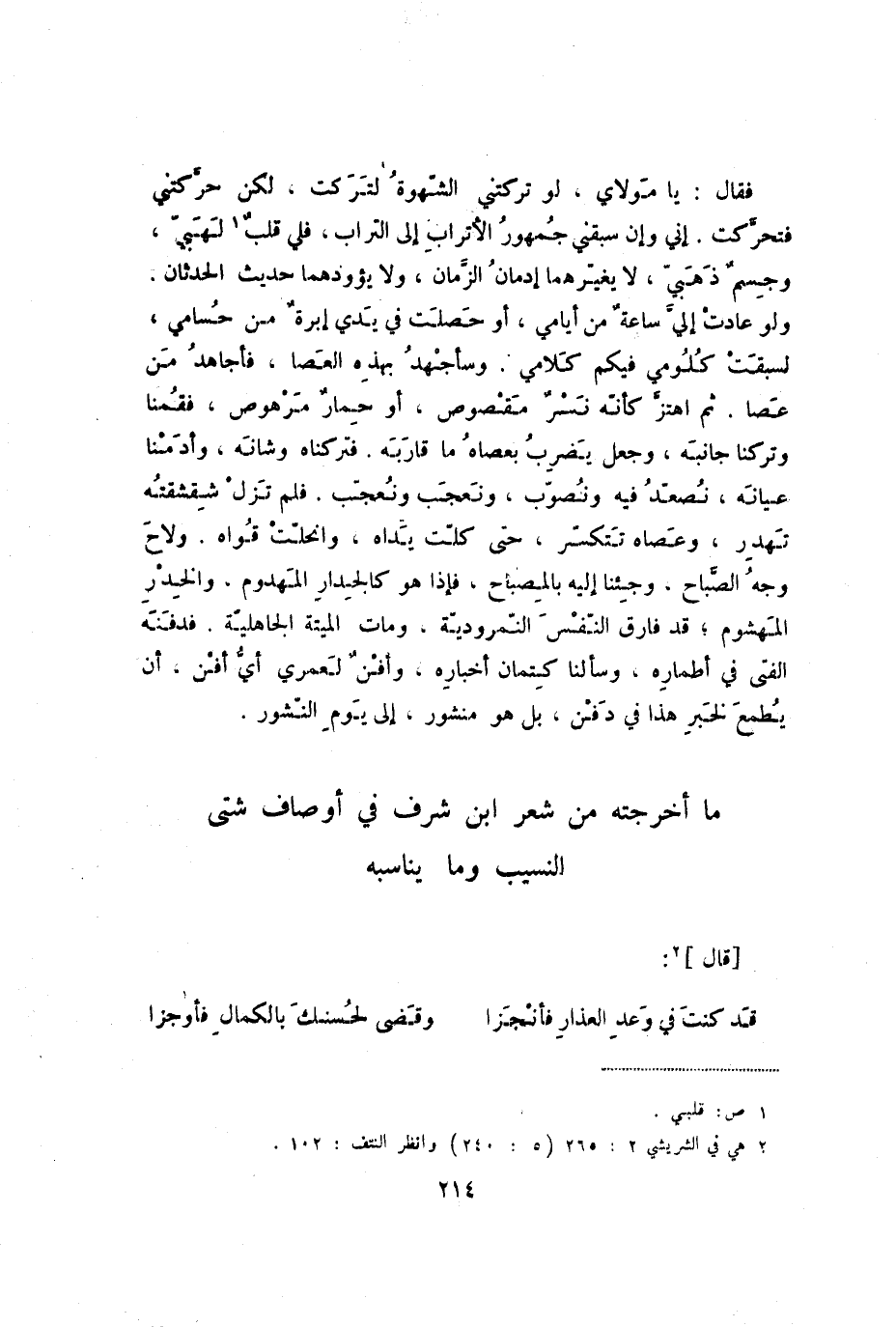 فقال: يا مولاي، لو تركتني الشهوة لتركت، لكن حركتني فتحركت. إني وإن سبقني جمهور الأتراب إلى التراب، فلي قلب لهبي، وجسم ذهبي، لا يغيرهما إدمان الزمان، ولا يؤودهما حديث الحدثان. ولو عادت إليّ ساعة من أيامي، أو حصلت في يدي إبرة من حسامي، لسبقت كلومي فيكم كلامي، وسأجهد بهذه العصا، فأجاهد من عصا. ثم اهتز كأنه نسر مقصوص، أو حمار مرهوص، فقمنا وتركنا جانبه، وجعل يضرب بعصاه ما قاربه. فتركناه وشانه، وأدمنا عيانه، نصعد فيه ونصوب، ونعجب ونُعجب. فلم تزل شقشقته تهدر، وعصاه تتكسر، حتى كلت يداه، وانحلت قواه. ولاح وجه الصباح، وجئنا إليه بالمصباح، فإذا هو كالجدار المهدوم، والخدر المهشوم؛ قد فارق النفس النمرودية، ومات الميتة الجاهلية. فدفنه الفتى في أطماره، وسألنا كتمان أخباره، وأفن لعمري أي أفن، أن يطمع لخبر هذا في دفن، بل هو منشور، إلى يوم النشور.