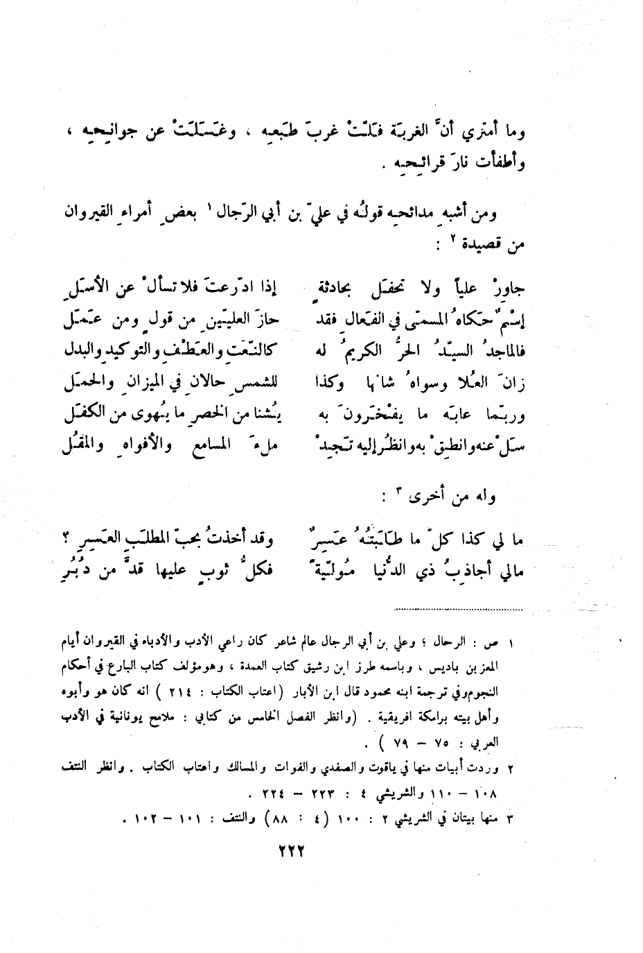 ومن أشبه مدائحه قوله في علي بن أبي الرجال بعض أمراء القيروان من قصيدة: