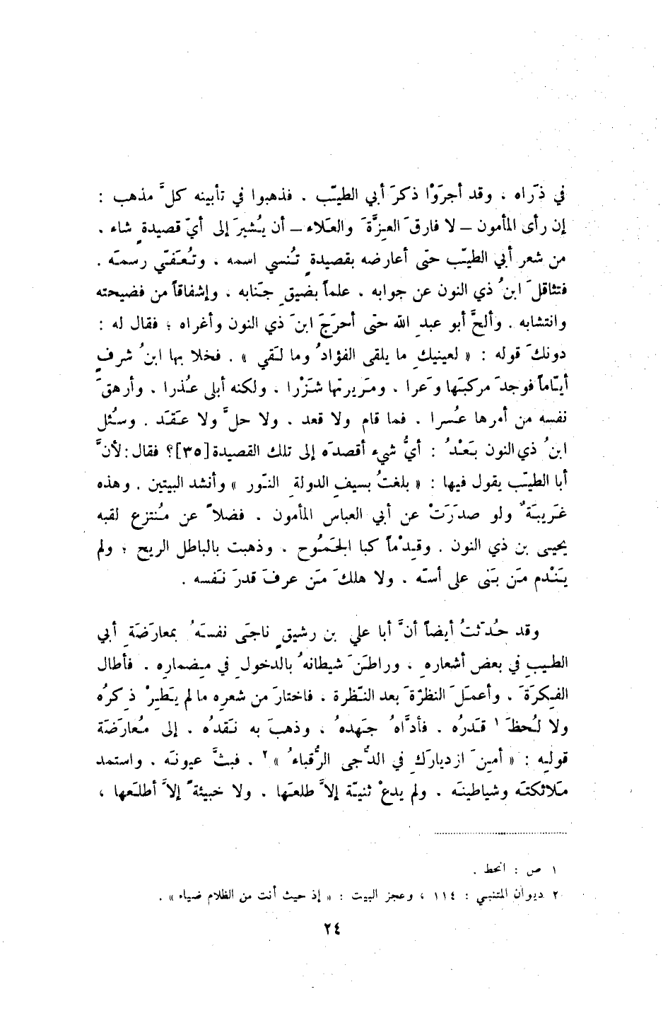 في ذراه، وقد أجروا ذكر أبي الطيب، فذهبوا في تأبينه كل مذهب: إن راى المأمون - لا فارق العزة والعلاء - أن يشير إلى أي قصيدة شاء. من شعر أبي الطيب حتى أعارضه بقصيدة تنسي أسمه، وتعفي رسمه، فتثاقل أبن ذي النون عن جوابه، علما بضيق جنابه، وإشفاقا من فضيحته وانتشابه. وألح أبو عبد الله حتى أحرج أبن ذي النون وأغراه؛ فقال له: دونك قوله: " لعينيك ما يلقى الفؤاد وما لقي ". فخلا بها ابن شرف أياما فوجد مركبها وعرا، ومريرتها شزرا، ولكنه أبلى عذرا، وأرهق نفسه من أمره عسرا، فما قام ولا قعد، ولا حل ولا عقد. وسئل أبن ذي النون بعد: أي شيء أقصده إلى تلك القصيدة [35]- فقال: لأن أبي الطيب يقول فيها: " بلغت بسيف الدولة النور " وأنشد البيتين وهذه غريبة ولو صدرت عن أبي العباس المأمون، فضلا عن منتزع لقبه يحيى بن ذي النون. وقدما كبا الجموح، وذهبت بالباطل الريح؛ ولم يندم من بني على أسه، ولا هلك من عرف قدر نفسه.