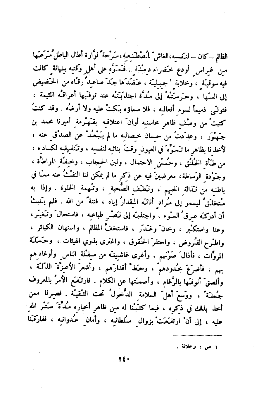 الظالم - كان - لنفسه، الغاش لمصطنعه، سرحةً نوارة أطال الباطل مرعها من غراس أودع خضراء دمنة. فموه على أهل وقته بليانة كانت فيه سوقية، وخلابة جبلية، عضدها جدَ صاعدُ رقاه من الحضيض إلى السها، وحرسته إلى مدة اجتذبته عند توفيها أعراقه اللئيمة، فتولى ذميماً لسوءِ أفعاله، فلا سماؤه بكتْ عليه ولاأرضهُ، وقد كنتُ كتبت من وصف ظاهر محاسنه أوان اعتلاقه بقهرمة أميرنا محمد بن جهور، وعددت من حسان خصاله ما لم يبعد عن الصدق عنه، لأخذنا بظاهر ما تموه في العيون وقت بنائه لنفسه، وتنفيقه لكساده، من طأة الخلق، وحسن الاحتمال، ولين الحجاب، وخفة المواطأة، وجودة الوساطة، معرضين فيه عن ذكر ما لم يمكن لنا النفث عنه مما في باطنه من نذالة الخيم، ونطف الصحبة، وتهمة الخلوة. وإذا به متخلق ليسمو إلى مراد أناله المقدار إياه، فتنة من الله. فلم يلبث أن أدركه عرق السوء، واجتذبه إلى نصر طباعه، فاستحال وتغير، وعتا واستكبر، وخان وغدر فاستخف المظالم، واستهان الكبائر، واطرح الفروض، واحتقر الحقوق، واغترى بذوي الهيئات، وحملة المروات. فأذال صونهم، وأغرى غاشيته من سفلة الناسِ وأوغادهم بهم، فأضرع خدودهم، وحط أقدارهم، وأشعر الأعزة الذلة، وألصق أنوفها بالرغام، وأصمتها عن الكلام. فارتفع الأمر بالمعروف جملةً، ووسع أهل السلامة الدخول تحت التقية. فصرنا ممن أخذ بذلك في ذكره، فيما كتبنا له من ظاهر أخبار مدة ستر الله عليه، إلى أن ارتفعت بزوال سلطانه، وأمان عدوانه، ففارقنا