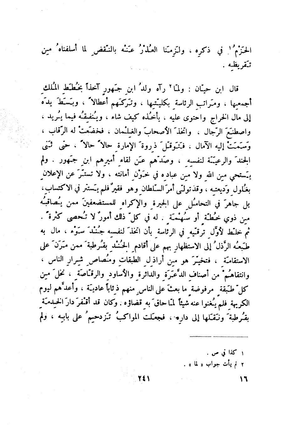 قال ابن حيان: ولما رآه ولد ابن جهور آخذاً بخطط الملكِ اجمعها. ومراتب الرئاسة بكليتها. وتركهم أعطالا. وبسط يده إلى مال الخراج وأحتوى عليه. يأخذه كيف شاء، وينفقه فيما يريد، واصطنع الرجال، وأتخذ الأصحاب والغلمان. فخضعت له الرقاب، وسمت إليه الآمال. فتوقل ذروه الإمارة حالاً حالاً، حتى ثنى الجند والرعية لنفسه، وصدهم عن لقاء أميرهم ابن جهور. ولم يستحي من الله ولا من عباده في خون أمانتي. ولا تستر عن الإعلان بغلول وديعته، وقد تولى أمر السلطان وهو فقير فلم يستتر في الاكتساب، بل جاهر في التحامل على الجيرة والإكراه بالمستضعفين ممن يصاقبه من ذوي خطة أو سهمةٍ. له في كل ذلك أمور لا تحصى كثرة. ثم خلط لأول ترقية في الرئاسة بان اتخذ لنفسه جند سوء. مال به طبعه الرذل إلى الاستظهار بهم على أقادم الجند بقرطبة ممن مرن على الاستقامة، فتخير هو من أراذل الطبقات ومصاص شرار الناس، وانتقاهم من أصناف الدعرة والدائرة والأساود والرقاصة، نخل من كل طبقةٍ مرفوضة ما بعث على الناس منهم ذئاباً عادية، وأعدهم ليوم الكريهة فلم يغنوا عنهم شيئاً لما حاق به قضاؤه. وكان قد أقفر دار الخدمة في قرطبة ونقلها إلى داره، فجعلت المواكب تزدحم على بابه، ولم