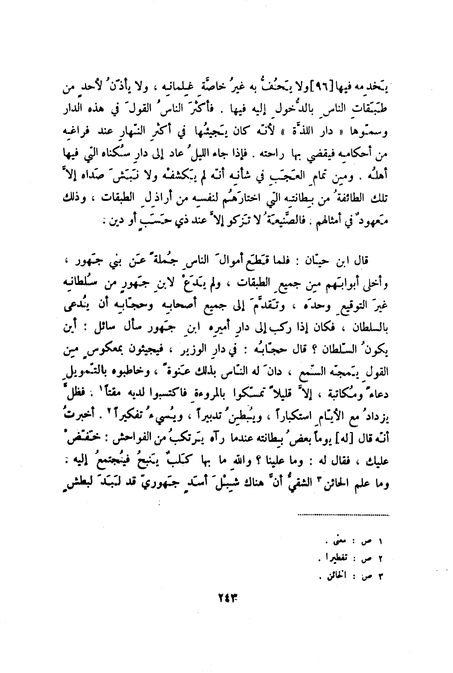 يخدمه فيها [96] ولا يحف به غير خاصة غلمانه، ولا يأذن لأحد من طبقات الناس بالدخول إليه فيها. فأكثر الناس القول في هذه الدار وسموها " دار اللذة " لأنه كان يجيشها في اكثر النهار عند فراغه من أحكامه فيقضي بها راحته. فإذا جاء الليل عاد إلى دار سكناه التي فيها أهله. ومن تمام العجب في شانه انه لم يكشفه ولا نبش صداه إلا تلك الطائفة من بطانته التي اختارهم لنفسه من أرذال الطبقات، وذلك معهود في أمثالهم. فالصنيعة لا تزكو إلا عند ذي حسب ودين.