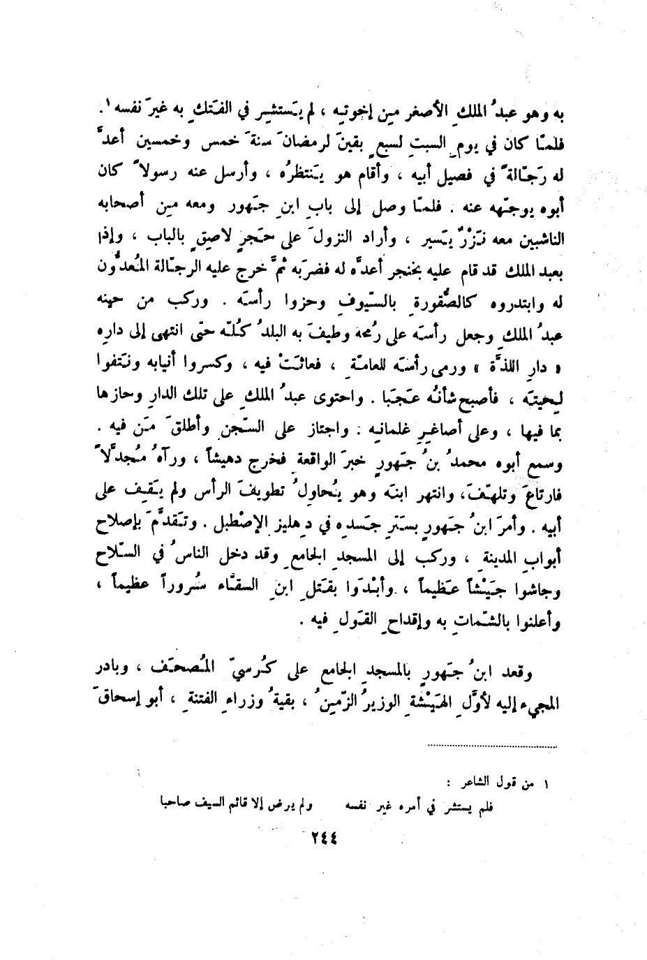 به وهو عبد الملك الأصغر من اخوته، لم يستشر في الفتك به غير نفسه. فلما كان في يوم السبت لسبع بقين لرمضان سنة خمس وخمسين أعد له رجالةً في فصيل أبيه، واقام هو ينتظره، وأرسل عنه رسولاً كان أبوه يوجهه عنه. فلما وصل إلى باب ابن جهور ومعه من أصحابه الناشبين معه نزر يسير، وأراد النزول على حجر لاصق بالباب، وإذا بعبد الملك قد قام عليه بخنجر أعده له فضربه ثم خرج عليه الرجالة المعدون له وابتدروه كالصقور بالسيوف وحزوا رأسه. وركب من حينه عبد الملك وجعل رأسه على رمحه وطيف به البلد كله حتى انتهى إلى داره " دار اللذة " ورمى رأسه للعامة، فعاثت فيه، وكسروا أنيابه ونتفوا لحيته، فأصبح شأنه عجباً. واحتوى عبد الملك على تلك الدار وحازها بما فيها، وعلى أصاغر غلمانه. واجتاز على السجن وأطلق من فيه. وسمع أبوه محمد بن جهور خبر الواقعة فخرج دهيشاً، ورآه مجدلاً فارتاع وتلهف، وانتهز ابنه وهو يحاول تطويف الرأس ولم يقف على أبيه. وأمر ابن جهور بستر جسده في دهليز الإصطبل. وتقدم بإصلاح أبواب المدينة، وركب إلى المسجد الجامع وقد دخل الناس في السلاح وجاشوا جيشاً عظيماً، وأبدوا بقتل ابن السقاء سروراً عظيماً، وأعلنوا بالشمات به وإقداح القول فيه.