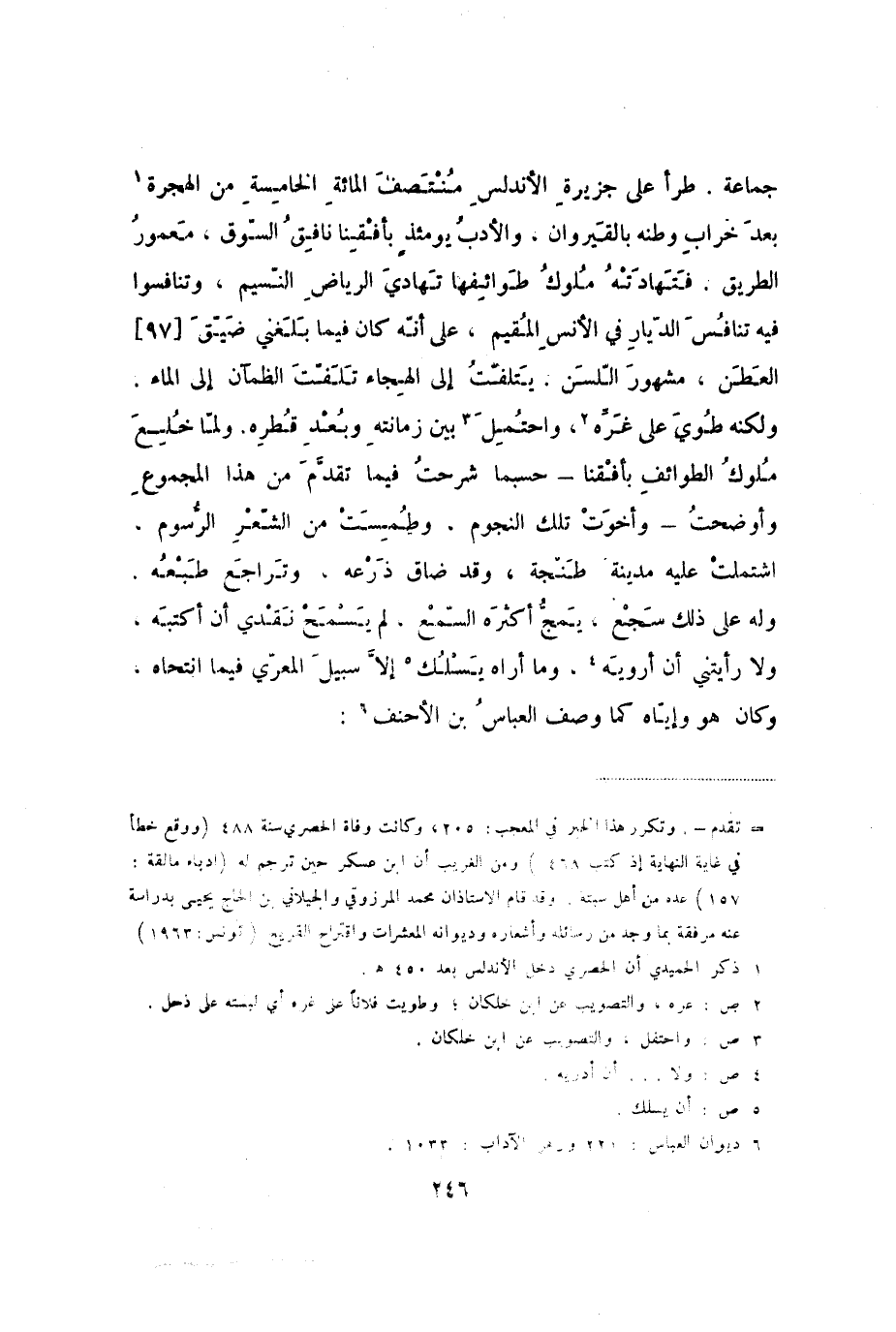 جماعة. طرأ على جزيرة الأندلس منتصف المائة الخامسة من الهجرة بعد خراب وطنه بالقيروان، والأدب يومئذ بأفقنا نافق السوق، معمور الطريق. فتهادته ملوك طوائفها تهادي الرياض النسيم، وتنافسوا فيه تنافس الديار في الأنس المقيم، على أنه كان فيما بلغني ضيق [97] العطن، مشهور اللسن. يتلفت إلى الهجاء تلفت الظمآن إلى الماء. ولكنه طوي على غره، واحتمل بين زمانته وبعد قطره. ولما خلع ملوك الطوائف بأفقنا - حسبما شرحت فيما تقدم من هذا المجموع وأوضحت - وأخوت تلك النجوم، وطمست من الشعر الرسوم، اشتملت عليه مدينة طنجة، وقد ضاق ذرعه، وتراجع طبعه. وله على ذلك سجع، يمج أكثره السمع، لم يسمح نقدي أن أكتبه، ولا رأيتني أن أرويه، وما أراه يسلك إلا سبيل المعري فيما انتحاه، وكان هو وإياه كما وصف العباس بن الأحنف: