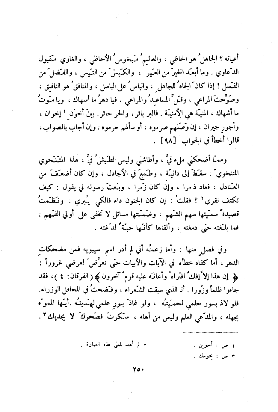 وفي فصل منها: وأما زعمه أني لم أدر اسم سيبويه فمن مضحكات الدهر، أما كفاه خطأه في الآيات والأبيات حتى تعرض لعرضي غروراً: {إن هذا إلا إفك افتراه وأعانه عليه قوم آخرون} (الفرقان: 4) ، فقد جاءوا ظلماً وزوراً. أنا الذي سبقت الشعراء، وفضحت في المحافل الوزراء. فلو لاذ بسور حلمي لحميته، ولو عاذ بنور علمي لهديته، أيها المموه بجهله، والمدعي العلم وليس من أهله، سكرت فصحوك لا يجديك.