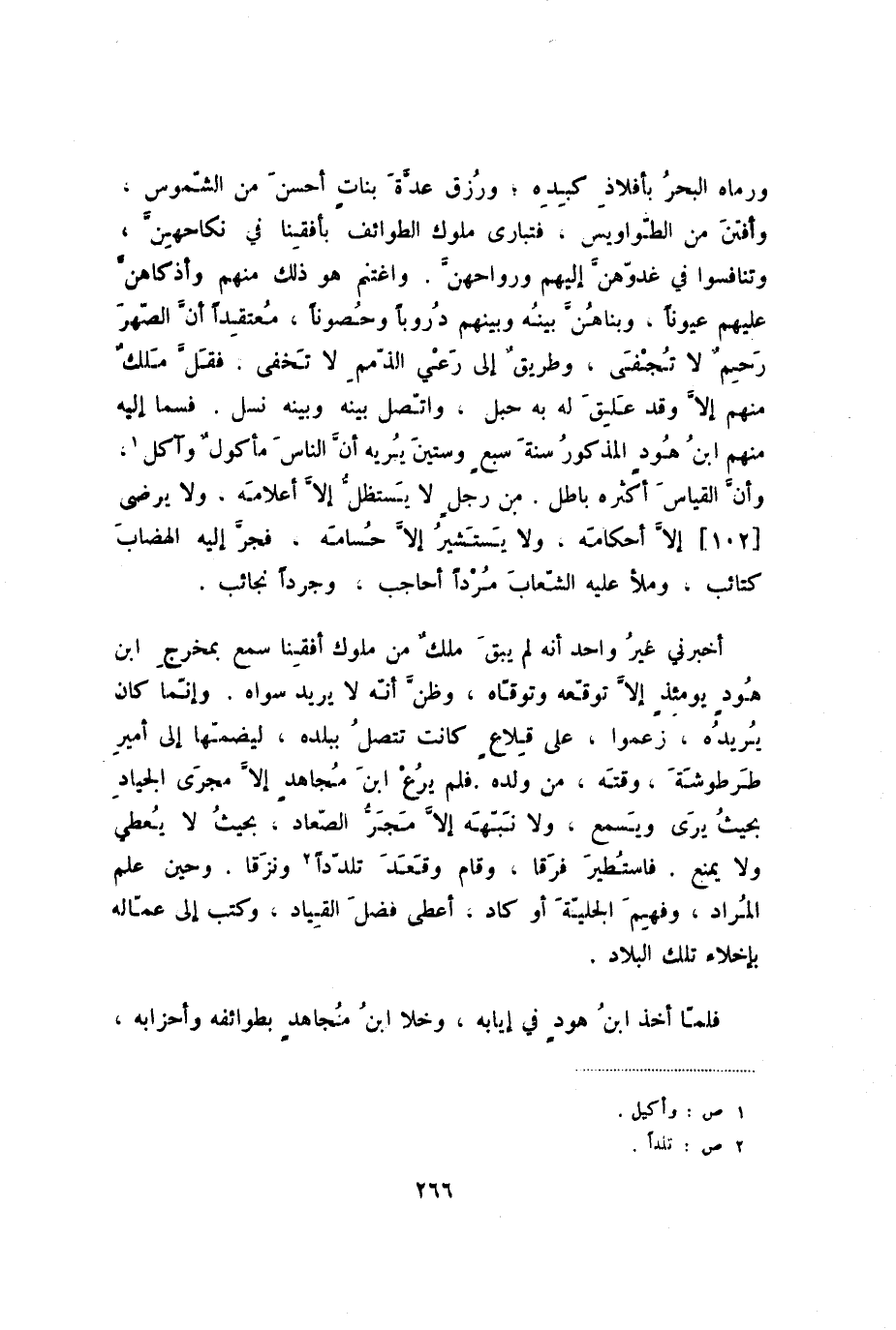 ورماه البحر بأفلاذ كبده؛ ورزق عدة بنات أحسن من الشموس، وأفنن من الطواويس، فتبارى ملوك الطوائف بأفقنا في نكاحهن، وتنافسوا في غدوهن إليهم ورواحهن. واغتنم هو ذلك منهم وأذكاهن عليهم عيوناً، وبناهن بينه وبينهم دروباً وحصوناً، معتقداً أن الصهر رحم لا تجفى، وطريق إلى رعي الذمم لا تخفى. فقل ملك منهم إلا وقد علق له به حبل، واتصل بينه وبينه نسل. فسما إليه منهم ابن هود المذكور سنة سبع وستين يريه أن الناس مأكول وآكل، وأن القياس أكثره باطل. من رجل لا يستظل إلا أعلامه، ولا يرضى [102] إلا أحكامه، ولا يستشير إلا حسامه، فجر إليه الهضاب كتائب، وملأ عليه الشعاب مرداً أحاجب، وجرداً نجائب.