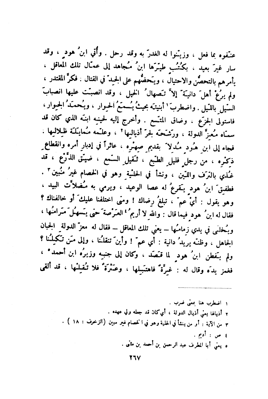 عنفوه بما فعل، وزينوا له الغدر به وقد رحل. وأتي ابن هود، وقد سار غير بعيد، بكتب طيرها ابن مجاهد إلى عمال تلك المعاقل، يأمرهم بالتحصن والاحتيال، ويحضهم على الجد في القتال. فكر المقتدر، ولم يرع أهل دانية إلا تصهال الخيل، وقد انصبت عليها انصباب السيل بالليل. واضطرب أبنيته بحيث يسمع الحوار، ويحمد الجوار، فاستولى الجزع، وضاق المتسع، وأخرج إليه لحينه ابنه الذي كان قد سماه معز الدولة، ورشحه لجر أذيالها، وعلمه ممايلة ظلالها، فجاء إلى ابن هود مدلا بقديم صهره، عاثراً في إدبار أمره وانقطاع ذكره. من رجل فليل الطبع، ثقيل السمع، ضيق الذرع، قد غذي بالترف واللين، ونشأ في الحلية وهو في الخصام غير مبين، فطفق ابن هود يقرع له عصا الوعيد، ويرمي به مضلات البيد، وهو يقول: أي عم، تبلغ رضاك! ومتى اختلفنا عليك أو خالفناك - فقال له ابن هود فيما قال: والله لا أريم العرصة حتى يسهل مرامها، ويخلى في يدي زمامها - يعني تلك المعاقل - فقال له معز الدولة الجبان الجاهل، وظنه يريد دانية: أي عم! وأين تنقلنا، وإلى من تكلنا - ولم يفطن ابن هود لما قصد، وكان إلى جنبه وزيره ابن أحمد، فغمز يده وقال له: غرة فاهتبلها، وعثرة فلا تقلها، قد ألقى