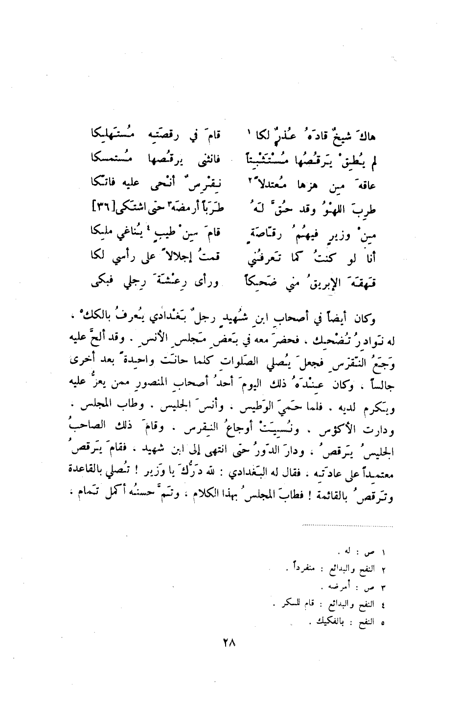 قهقه الإبريق مني ضحكا ... ورأى رعشة رجلي فبكى وكان أيضا في أصحاب ابن شهيد رجل بغدادي يعرف بالكك، له نوادر تضحك، فحضر معه في بعض مجالس النس، وقد ألح عليه وجع النقرس فجعل يصلي الصلوات كلما حانت واحدة بعد أخرى جالسا، وكان عنده ذلك اليوم أحد أصحاب المنصور ممن يعز عليه ويكرم لديه، فلما حمي الوطيس، وانس الجليس، وطاب المجلس، ودارت الأكؤس، ونسيت أوجاع النقرس، وقام ذلك الصاحب الجليس يرقصن ودار الدور حتى انتهى إلى ابن شهيد، فقام يرقص معتمدا على عادته، فقال له البغدادي: لله درك يا وزير! تصلي بالقاعدة وترقص يا لقائمة! فطاب المجلس بهذا الكلام، وتم حسنه أكمل تمام