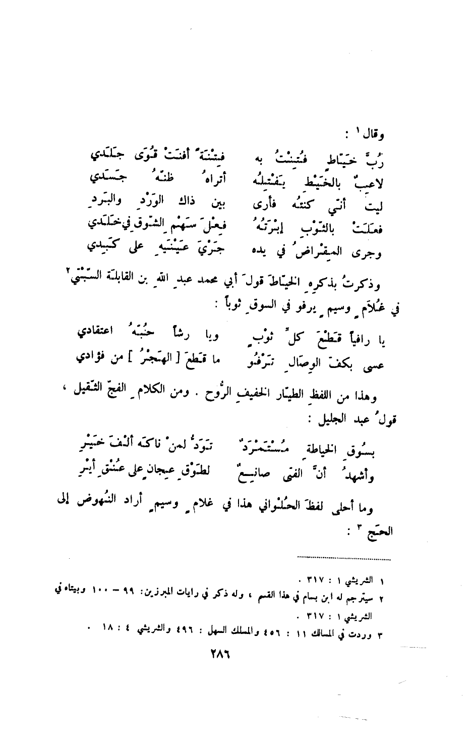 وجرى المقراض في يده ... جري عينيه على كبدي وذكرت بذكره الخياط قول أبي محمد عبد الله بن القابلة السبتي في غلام وسيم يرفو في السوق ثوباً: