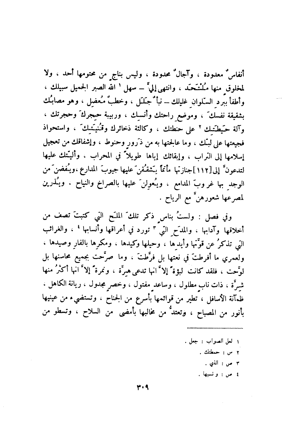 وفي فصل: ولست بناسٍ ذكر تلك الملح التي كتبت تصف من أخلاقها وآدابها، والمدح التي تورد في أعراقها وأنسابها، والغرائب التي تذكر عن قوتها وأيدها، وحيلها وكيدها، ومكرها بالفار وصيدها، ولعمري ما أفرطت في نعتها بل فرطت، وما صرحت بجميع محاسنها بل لوحت، فلقد كانت لبؤةً إلا أنها تدعى هرة، ونمرةً إلا أنها أكثر منها شرة، ذات نابٍ مطلول، وساعد مفتول، وخصر مجدول، ريانة الكاهل، ظمآنة الأسافل، تطير من قوائمها بأسرع من الجناح، وتستضيء من عينيها بأنوار من المصباح، وتعتد من مخالبها بأمضى من السلاح، وتسطو من