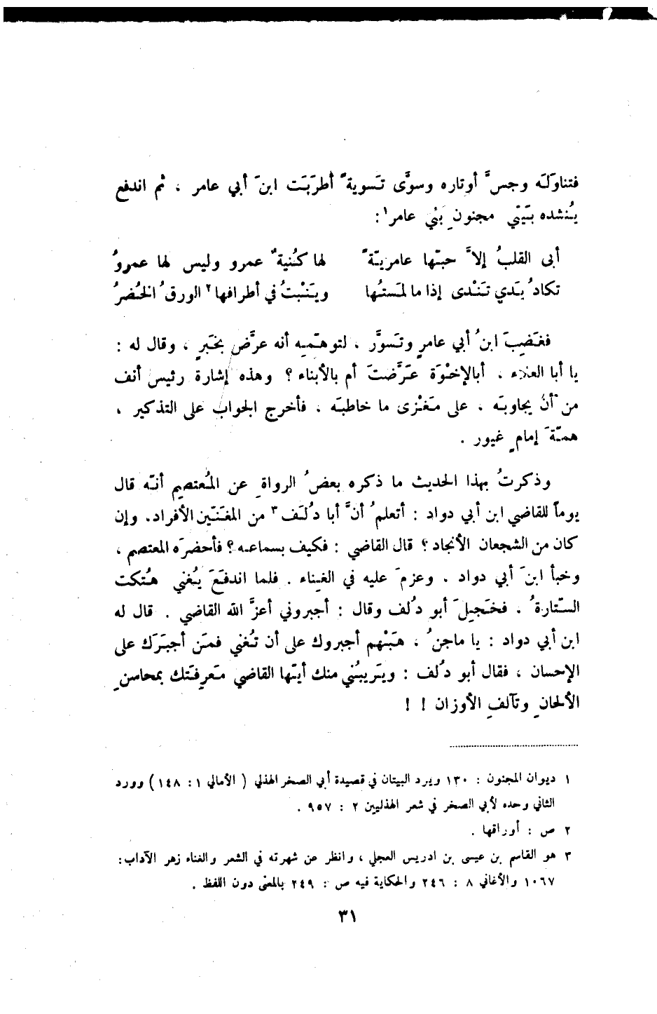 فتناوله وحبس أوتاره وسوى تسوية أطربت أبن أبي عامر، ثم اندفع ينشده بيتي مجنون بني عامر: