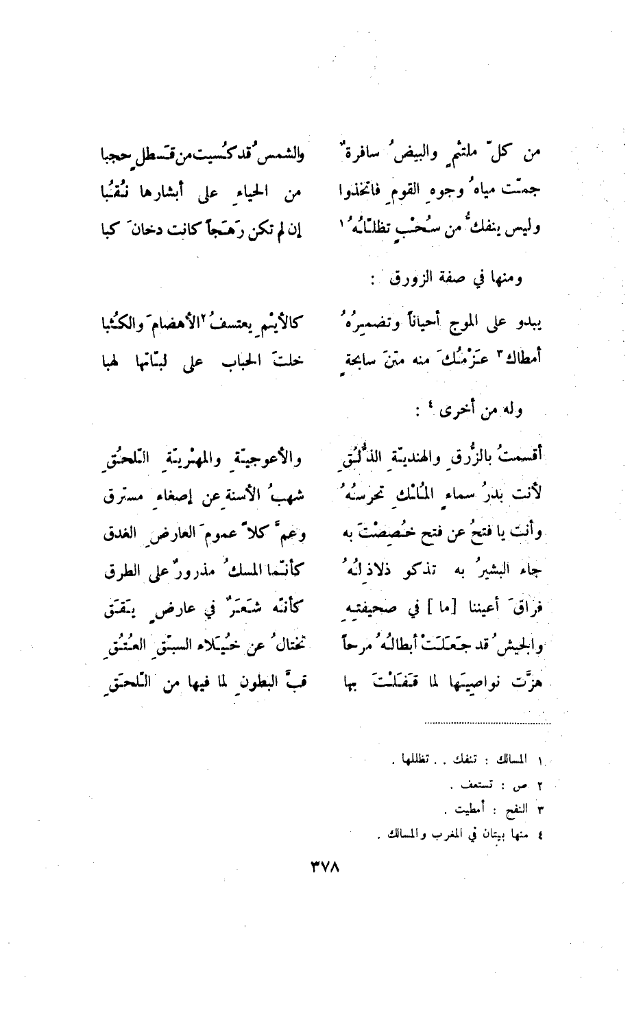 وليس ينفك من سحب تظلله ... إن لم تكن رهجاً كانت دخان كبا ومنها في صفة الزورق: