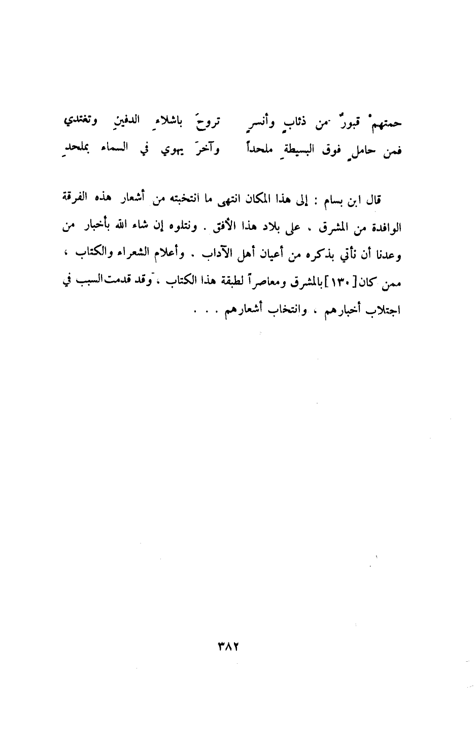 فمن حامل فوق البسيطة ملحداً ... وآخر يهوي في السماء بملحد قال ابن بسام: إلى هذا المكان انتهى ما انتخبته من أشعار هذه الفرقة الوافدة من المشرق، على بلاد هذا الأفق، ونتلوه إن شاء الله بأخبار من وعدنا أن نأتي بذكره من أعيان أهل الآداب، وأعلام الشعراء والكتاب، ممن كان [130] بالمشرق ومعاصراً لطبقة هذا الكتاب، وقد قدمت السبب في اجتلاب أخبارهم، وانتخاب أشعارهم.....