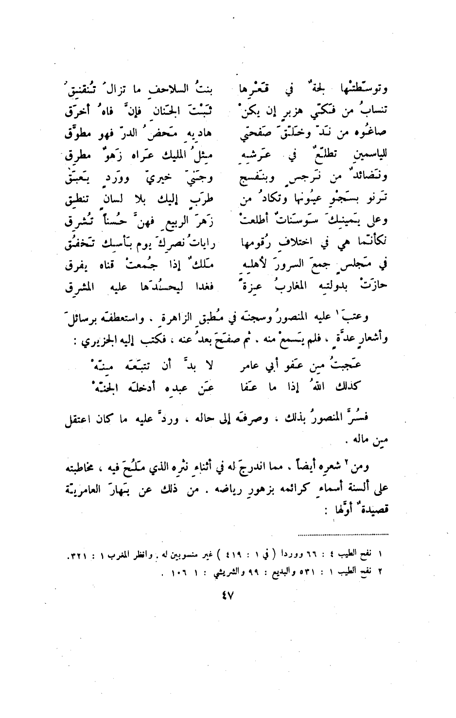 حازت بدولته المغارب عزة ... فغدا ليحسدها عليه المشرق وعتب عليه المنصور وسجنه في مطبق الزاهرة، وأستعطفه برسائل وأشعار عدة، فلم يسمع منه، ثم صفح بعد عنه، فكتب إليه الجزيري: