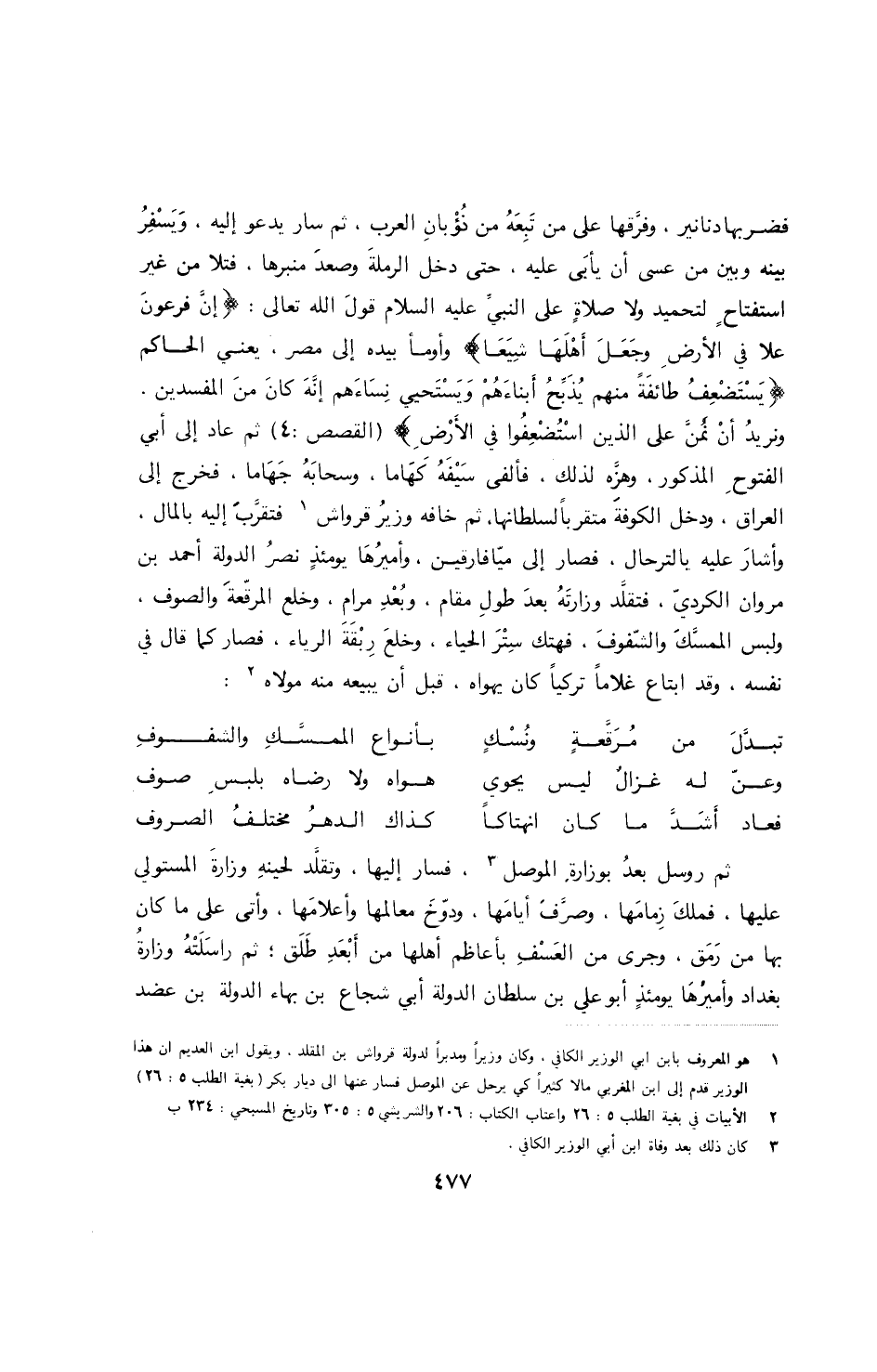 الدولة بن ركن الدولة أبي علي، فتبحبح ذروتها، واقتعد لوقته صهوتها، فانتظمت له الأيام، وحمد على يديه النقض والإبرام، وبلغ الحال التي تصغر عنها النعم، وتقصر دونها الهمم، ثم إن أبا علي أوقع بمن كان يتهمه من الأتراك، وكان قد نهاه الوزير، وأشار عليه بما يقتضي التدبير، فأبى إلا ركوباً لرأسه، وإدلالاً بنفسه، فاضطرب العسكر اضطراباً اضطرهما جميعاً إلى الهرب، وأفضى بهما إلى استجارة أمير العرب.