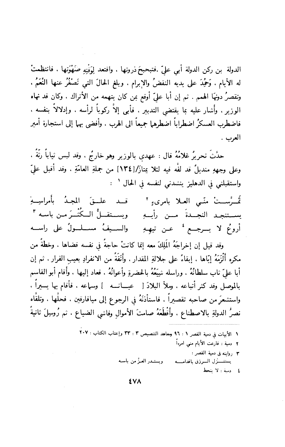 من بغداد للوزارة، واستأذن نصر الدولة، فخلى بينه وبين مراده، ولم يجد بداً من إسعاده، ووفاءً بإنجاز ميعاده، فلما برزت قبابه، وكادت تستقل ركابه، خوف نصر الدولة عاقبة مكره، وأشير عليه بالرأي في أمره، فسقاه شربةً كانت آخر زاده، ووفاءً بإنجاز ميعاده وتقدم حين أحس [بالموت] بحمله إلى الكوفة ليدفن في حجرة أعدها هنالك بازاء قبر أمير المؤمنين علي بن أبي طالب رضي الله عنه، فسير بتابوته مسيرة شهر، بين أيدي الحتوف، وتحت أظلال السيوف، أكرومةً ختم بها مجده، وأحدوثةً أبقاها في الناس خالدةً بعده.
