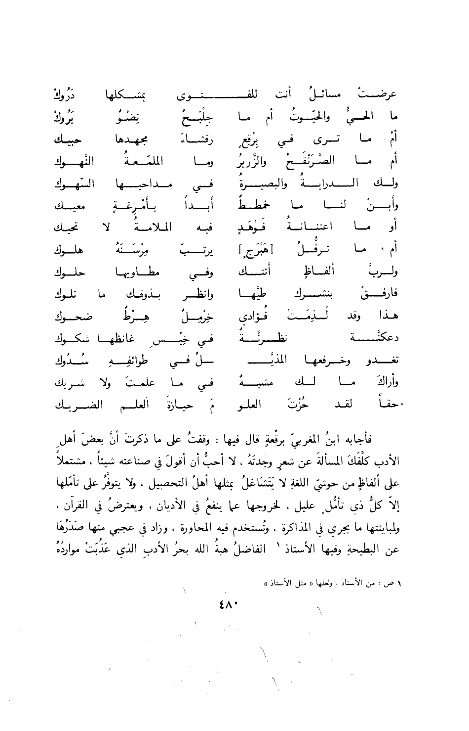 وفي فصل: فإن كان الغرض في هذه الأبيات الخزاب، المقفرة من الصواب، طلب الفائدة، فقد كان أن يناخ عليه بمقفلها، ويقصد إليه بمعضلها، فعنده مفتاح كل مسألة مقفلة، ومصباح كل داجيةٍ مشكلة؛ بل لست أشك أن هذا السائل لو جاوره صامتاً عن استخباره، وعكف على ذلك الجناب كأنما لجأ في طي إضماره، لأعداه رقة نسيم أرضه، وهذب (2) خاطره التقاط لفظه، حتى يغنيه الجوار عن الحوار، والاقتراب عن رجع الجواب؛ وإن كان قصد الامتحان للمسؤول، وتعرض لهذا الموقف الزحول، فذلك اعجب: كيف لم يتأدب بآدابه الصالحة، ويعتني إلى هدايته الواضحة.