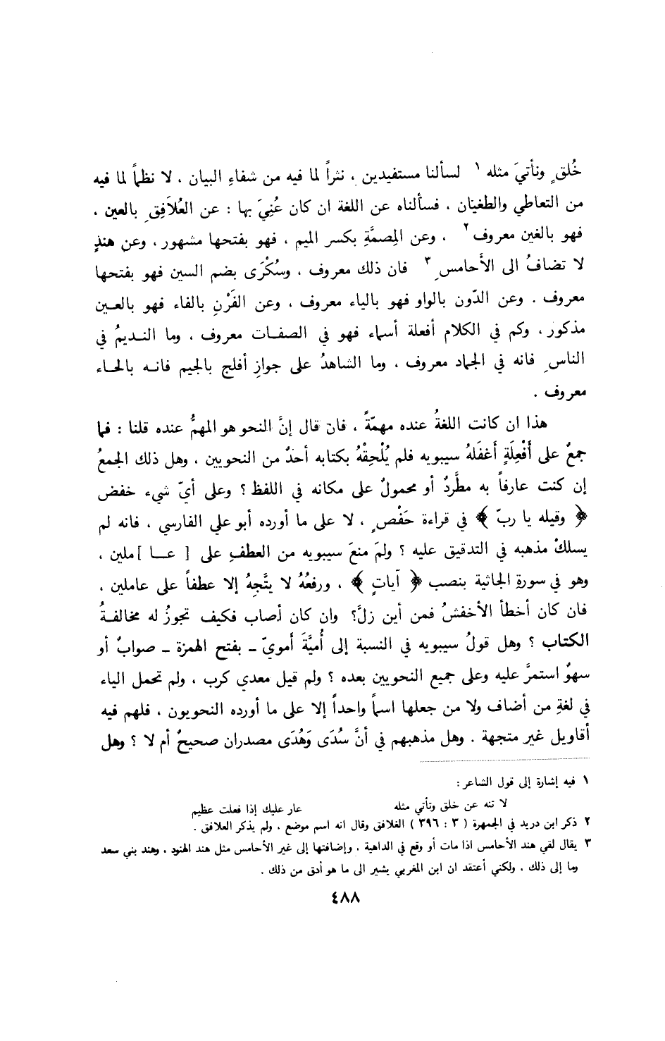 فإن قال: لست أتشاغل بعلوم المؤدبين، وإنما آخذ بمذهب الحافظ، إذ يقول: علم النسب والخبر علم الملوك، قلنا له: فمن أبو خلدة (1) فإن أبا جلدة (2) معروف، ومن العاض وما اشتقاقه (3) فإن العاص معروف، ومن حبشية - مفتوح الأول مخفف - فإنه بالتشديد وضم أوله معروف (4) - ومن عمرو بن معدي كرب غير صاحب: " أمن ريحانة الداعي السميع " (5) فإن هذا معروف - وما اسم امرئ القيس على الصحة لا على هذا الظاهر وعلى أن في اشتقاقه كلاماً طويلاً فإن هذا معروف - ومن الزبير غير الأسدي واليهودي فكلاهما معروفان - ومن الزبير بفتح الزاي فإنه بضمها معروف (6) - ومن القائل: