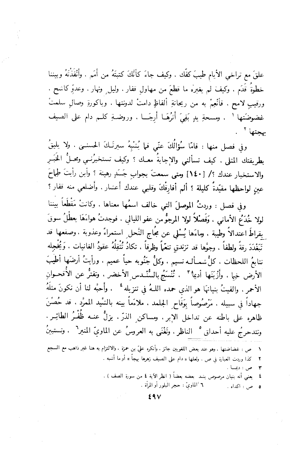 وفي فصل: لو أطقت تفصيل المجمل، وإيضاح المشكل، لجرت لك به يدي طلق الجموح، ولأغنتك أسماره عن الوتر الصدوح، إلا أن القب عليل، والخاطر كليل، والزمان ببلوغ الأمل بخيل.