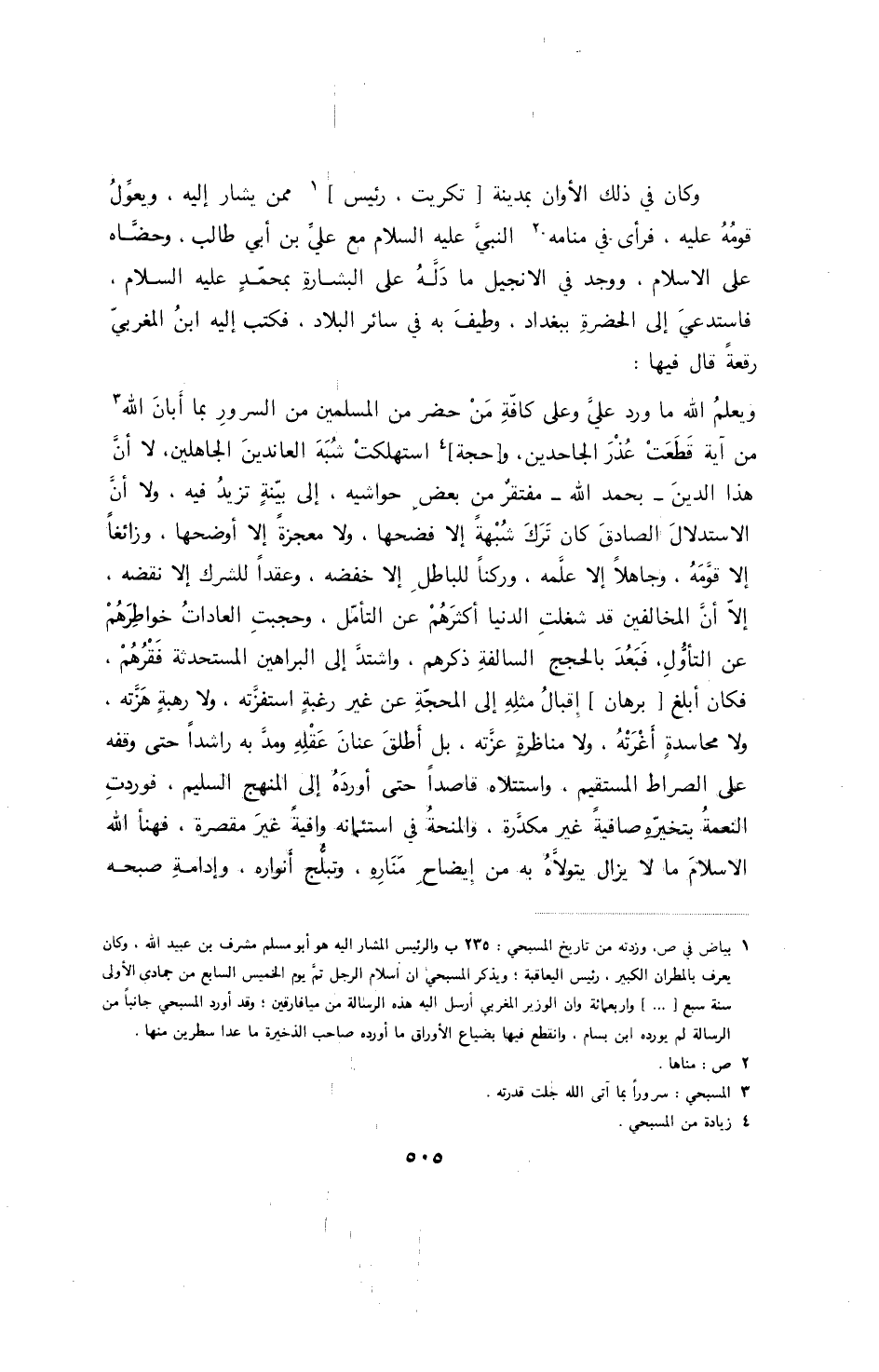 ضاحكا تتصدع عنه دياجير الشبهات، وتنجلي منه ملابس الضلالات، وهنأ الله الشيخ ما رآه له أهلا من هذا السناء الذي تقف دونه المعالي، وتضيء به ظلم الليالي، وغرس عنده التوفيق الذي يسترهن لواء النعمة، ويضمن بقاء العصمة.