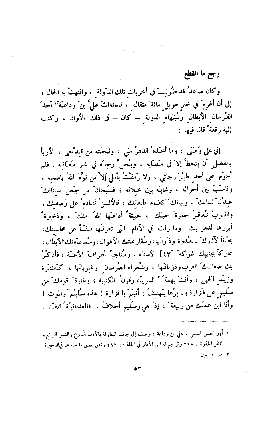 أني على وهني، وما أخذه الدهر مني، ونحته من قدحى، لأربأ بالفضل أن ينحط إلا في مصابه، ويحل رحله في غير معانه. فلم أحوم على أحد طير رجائي، ولا رمقت بأملي إلا من نوة الله باسمه، وناسب بين أحواله، وشاب بين خلاله؛ فسبحان من جعل سنانك عدل لسانك، وبيانك كفء طعانك، فالألسن تتنادم على وصفك، والقلوب تعاقر خمرة حبك، خبيئة أذاعها الله منك، وذخيرة أبرزها الدهر بك، وما زلت في الايام التي تعرفها منقبا على محاسنك، بحاثا لأثارك بالعدوة وذواتها، ومقارعتك الأهوال، ومماصعتك الأبطال، عاركا بجنبيك شوكة [43] الأسنة، ومماجيا أطراف الاعنة، فأذكر بك صعاليك العرب وذؤبانها، وشعراء الفرسان وغربانها، كعنتزة وزيد الخيا، وانت بهمة السرية وقرن الكتيبة؛ وغارة قومك من سليم على فرازة ونذيرها يهتف: أتيتم يافزازة! هذه سليم والموت! وأنا ابن عمك من ربيعة، إذ هي وسيم أحلاف، فالعدنانية تلفنا
