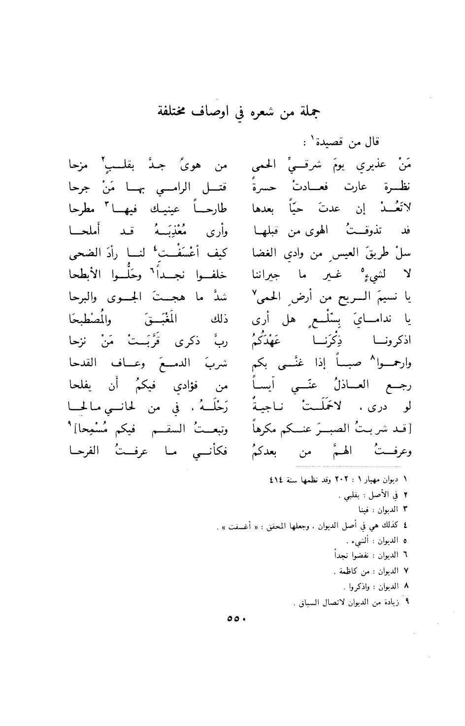 (4) الشعر في أمالي القالي 3: 127 وتشبيهات ابن أبي عون: 290 ونسب فيه لابن هرمة وكذلك في المختار: 290 وحماسة ابن الشجري: 269 وانظر ديوان ابن هرمة (جمع المعيبد) : 263 - 264 وفيخ تخريجات كثيرة.