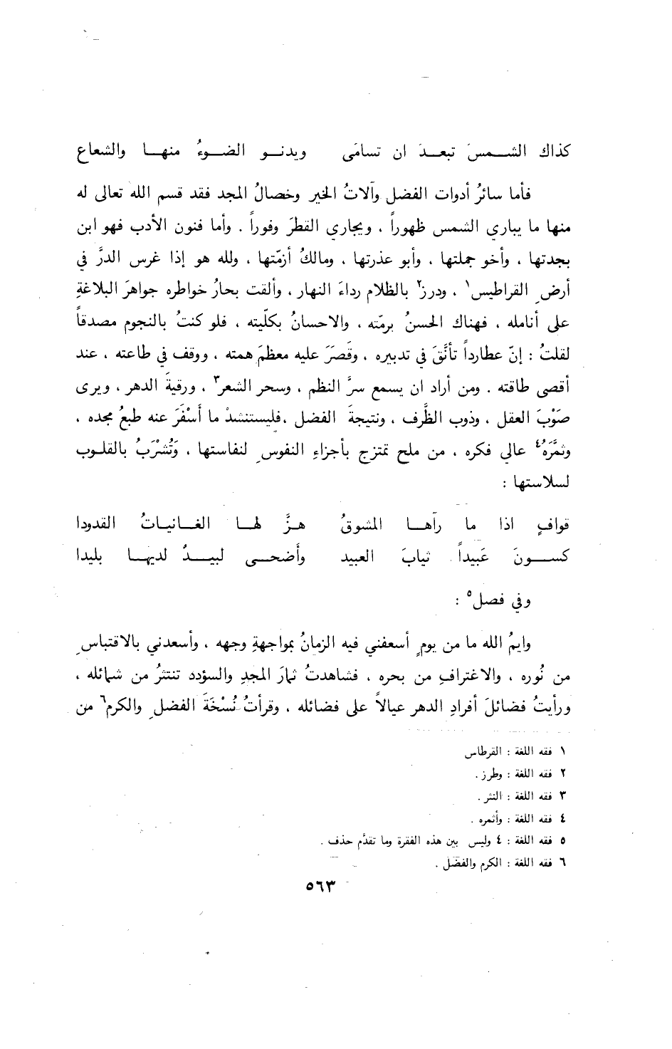 فاستغرقت أربعة أشهر هناك بحضرته، وتوفرت على خدمته، وما رمت في أكثر الأوقات في الليل والنهار عالي مجلسه، وتعطرت عند ركوبه بغبار موكبه، فبالله يميناً قد كنت غنياً عنها لو خفت [حنثاً] فيها أني ما أنكرت طرفاً من أخلافه، ولم أشاهد إلا شرفاً ومجداً من أحواله، وما رأيته اغتاب غائباً، أو سب حاضراً، أو حرم سائلاً، أو خيب آملاً، أو أطاع سلطان الغضب والحرد، أو تصلى بنار الضجر وبطش بطش المتجبر؛ وما وجدت المآثر إلا ما يتعاطاته، والمآثم إلا ما يتخطاه، فعوذته بالله تعالى من كل طرفٍ عائن، ومن كل صدرٍ خائن، هذا ولو أعارتني