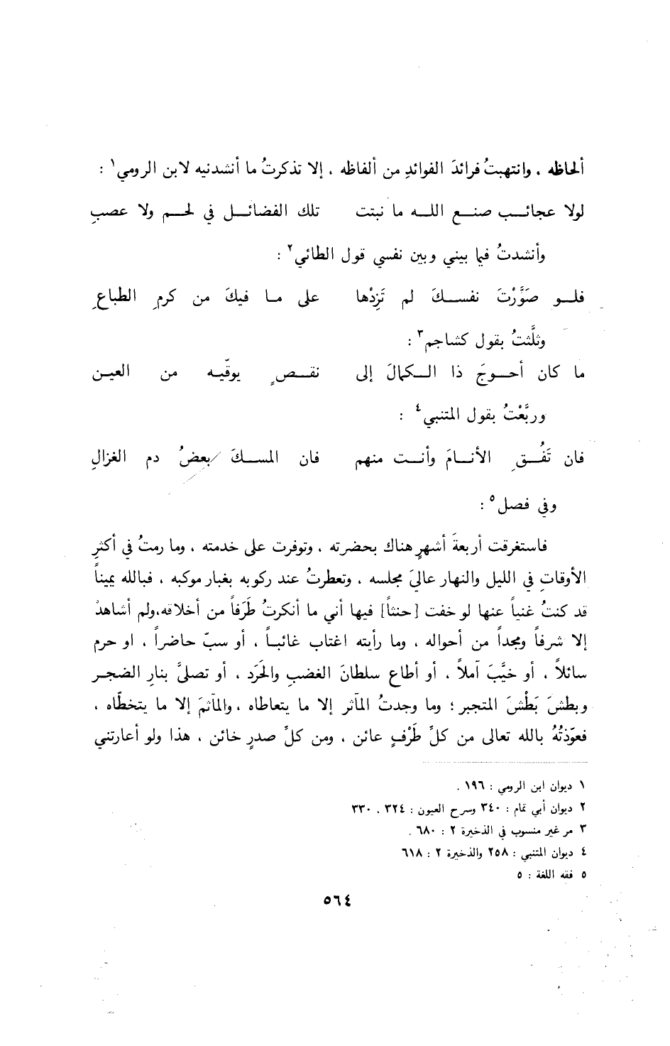 وما عدلت بمؤلفاتي عن اسمه ورسمه، إخلالاً بما يلزمني من حق سؤدده، بل إجلالاً [له] عما لا أرضاه للمرور بسمعه ولحظه، وتحامياً لعرض بضاعتي المزجاة على قوة نقده، وذهاباً بنفسي عن أن أهدي للشمس ضوءاً، أو أزيد في القمر نوراً، أو أكون كجالب المسك إلى أرض الترك، والعود إلى بلاد الهند، والعنبر إلى البحر الأخضر.