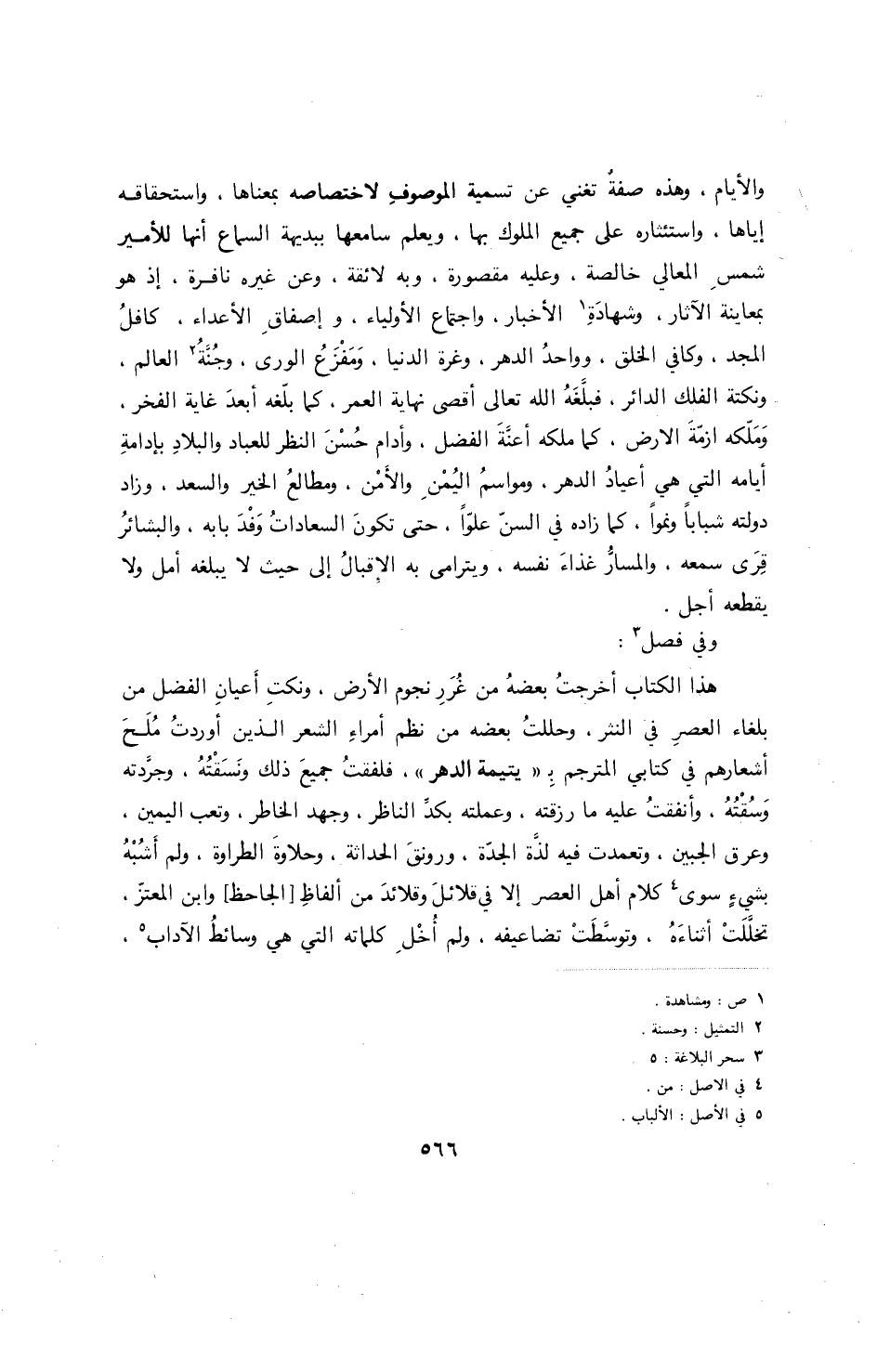 وقد كانت تجري في مجلسه العالي نكت من أقاويل أئمة الأدب في أسرار اللغة وجوامعها، ولطائفها وخصائصها، مما لم ينتهوا إلى جمع شملها، ولا توصلوا إلى نظمها، وإنما اتجهت لهم في أثناء التأليفات، وتصاعيف التصنيفات، لمع يسيرة كالتوقيعات، وفقر خفية كالإشارات، فيلوح لي - أدام الله عزه - بالبحث على أمثالها، وتحصيل أخواتها، وما ينخرط في سلكها، وأنا ألوذ بأكناف المحاجزة، وأحوم حول المدافعة، وأرعى روض المماطلة، لا تهاوناً بأمره الذي أراه كالمكتوبات، ولا أميزه عن المفروضات، ولكن تفادياً من قصور سهمي عن هدف إرادته، وانحرافاً عن الثقة بنفسي في عمل / [162] ما يصلح لخدمته، إلى أن اتفقت لي في بعض الأيام التي هي أعياد دهري، وأعيان عمري، مواكبة القمرين بمسايرة ركابه، ومواصلة السعدين بصلة جنابه (3) في متوجهه إلى فيروزباد، ومنها إلى حداد (4) ، بعض قراه من الشامات، عمرها الله بدوام عمره، فلما: