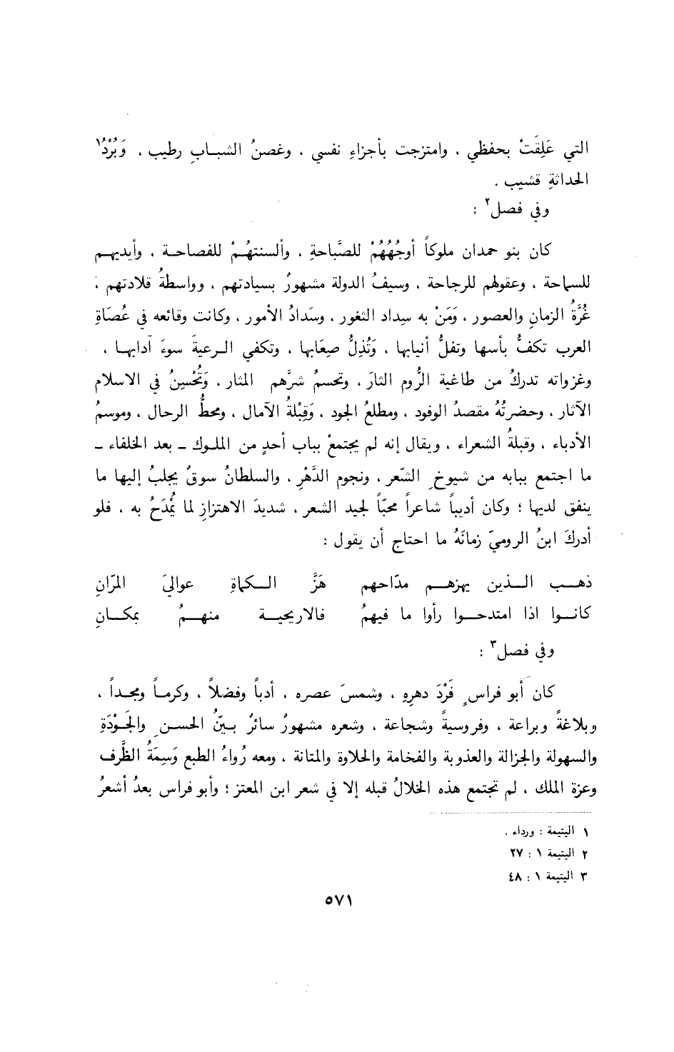 (2) اليتيمة: من محاسن شعر أبي فراس، وما محاسن شيء كله حسن.