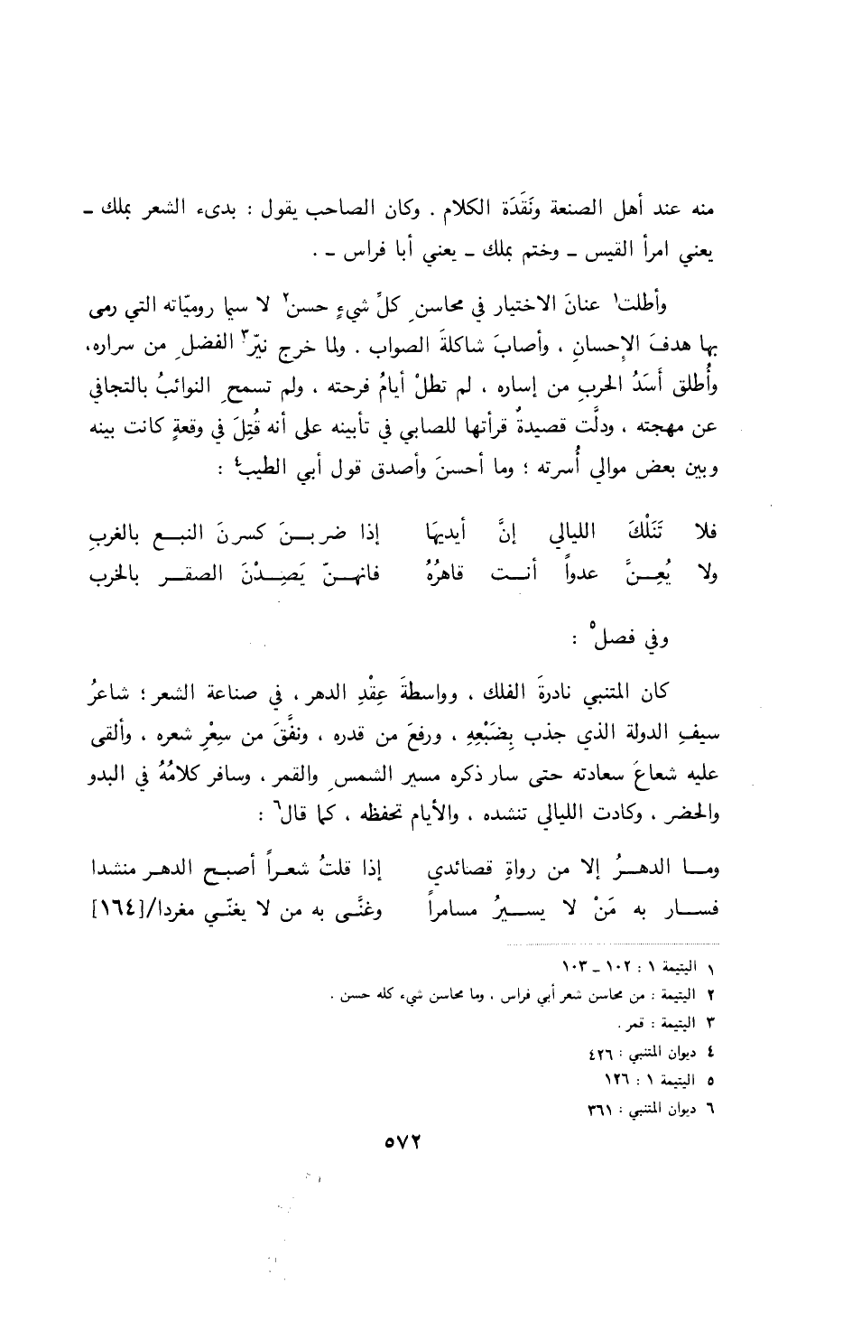 وخطأ (4) المتنبي في اللفظ والمعنى كثير، ويتبع الفقرة الغراء بالكلمة العوراء، ويفتتح (5) بذلك شعره، وما أكثر ما يحوم حول هذه الطريقة، ويعود لهذه العادة السيئة ويجمع بين البديع النادر والضعيف الساقط، فبينا هو يصوغ أفخر حلي، وينظم أحسن عقد، وينسج أنفس وشي، ويختال في حديقة ورد، إذا به قد رمى بالبيت والبيتين في إبعاد الاستعار وتعويض اللفظ وتعقيد المعنى، فمحا تلك المحاسن وكدر صفاءها وأعقب حلاوتها مرارة لا مساغ لها، واستهدف لسهام العائبين، فمن متمثل بقول الشاعر: