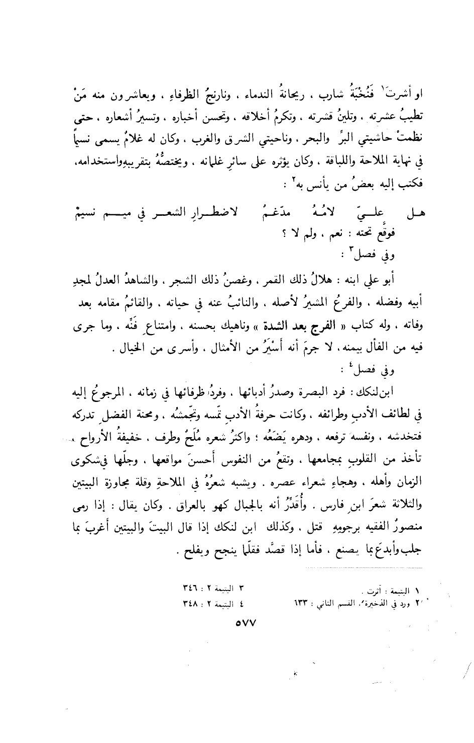 السلامي: من أشعر أهل العراق قولاً بالإطلاق، وشهادةً باستحقاق، وعلى ما أجريت من ذكره، شاهد عدل من شعره، الذي كتبت من محاسنه نزهة العيون ورقى القلوب وسر النفوس، ولم يزل بحضرة الصاحب بين خير مستفيض، وجاهٍ عريض، ونعم بيض، إلى أن آثر قصد حضرة عضد الدولة بشيراز، فجهزه الصاحب إليه وزوده كتاباً بخطه إلى أبي القاسم عبد العزيز بن يوسف قال فيه: " باعة الشعر أكثر من عدد الشعر، ومن يوثق أن حليته التي يؤديها من نسج فكره أقل من ذلك؛ وممن خبرته بالامتحان فأحمدته، وفررته بالإحسان واخترته (4) ، أبو الحسن السلامي، وله بديهة قوية، توفي على الروية، ومذهب / [166] في الإجادة يهش السمع لوعيه، كما يرتاح الطرف لرعيه، وقد امتطى أمله - وخير له - إلى الحضرة الجليلة رجاء أن يحصل في سواد أمثاله، ويظهر معه بياض حاله، فجهزت منه أمير الشعر في موكبه (5) ، وحليت فرس (6) البلاغة