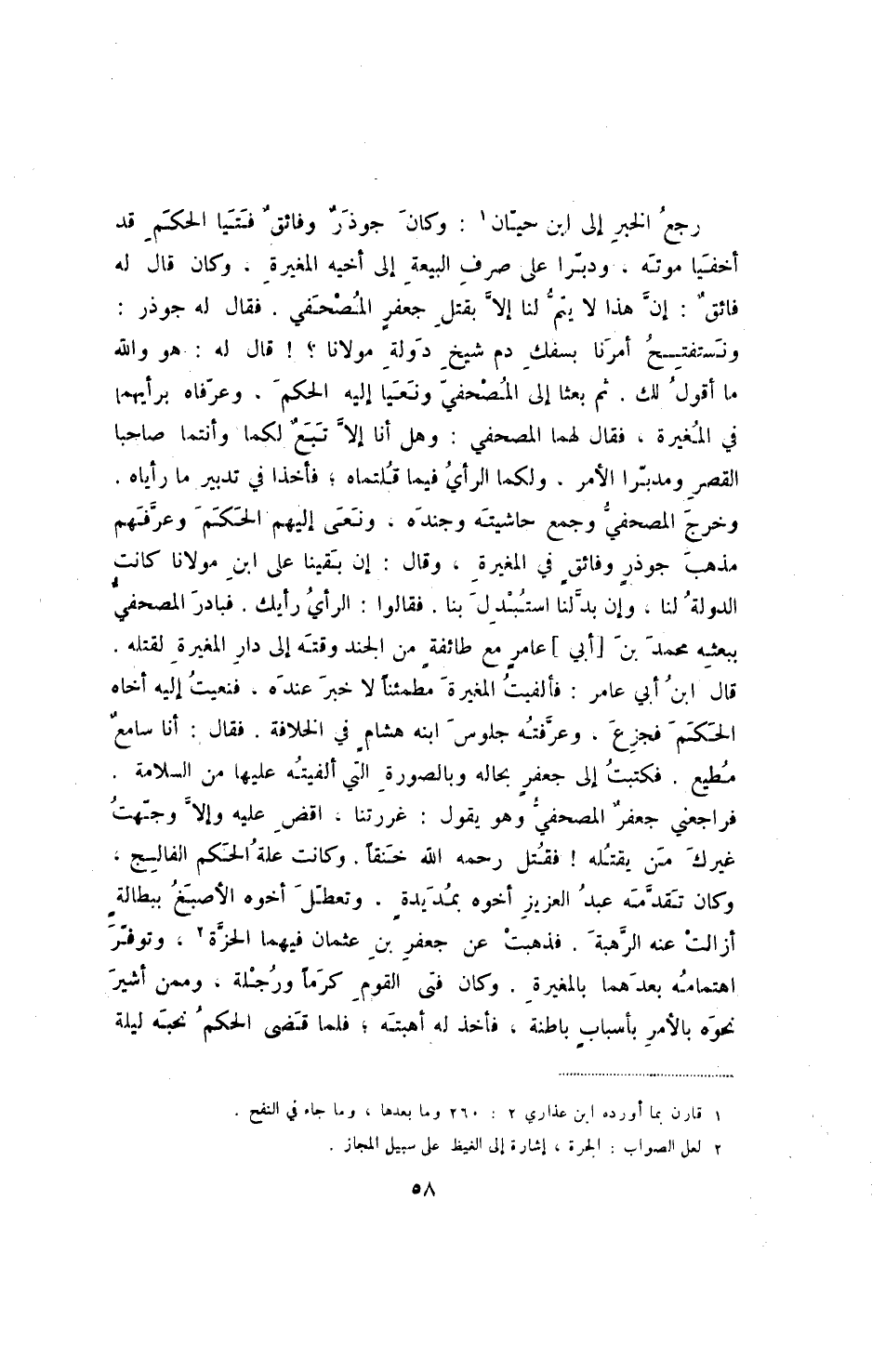 رجع الخبر إلى ابن حيان: وكان جوذر وفائق فتيا الحكم قد أخفيا موته، ودبرا على صرف البيعة إلى أخيه المغيرة. وكان قال له فائق: إن هذا لا يتم لنا إلا بقتل جعفرٍ المصحفي. فقال له جوذر: ونستفتح أمرنا بسفك دم شيخ دولة مولانا -! قال له: هو والله ما أقول لك. ثم بعثنا إلى المصحفي ونعيا إليه الحكم، وعرفاه برأيهما في المغيرة، فقال لهما المصحفي: وهل أنا إلا تبع لكما وأنتما صاحبا القصر ومدبرا الأمر، ولكما الرأي فيما قلتماه؛ فأخذا في تدبير ما رأياه. وخرج المصحفي وجمع حاشيته وجنده، ونعى إليهم الحكم وعرفهم مذهب جوذرٍ وفائق في المغيرة، وقال: إن بقينا على ابن مولانا كانت الدولة لنا. وإن بدلنا استبدل بنا. فقالوا: الرأي رأيك. فبادر المصحفي ببعثه محمد بن [أبي] عامر مع طائفة من الجند وقته إلى دار المغيرة لقتله. قال ابن أبي عامر: فألفيت المغيرة مطمئناً لا خبر عنده. فنعيت إليه أخاه الحكم فجزع. وعرفته جلوس ابنه هشام في الخلافة. فقال: أنا سامع مطيع. فكتبت إلى جعفر بحاله وبالصورة التي ألفيته عليها من السلامة. فراجعني جعفر المصحفي وهو يقول: غررتنا. اقض عليه وإلا وجهت غيرك من يقتله! فقتل رحمه الله خنقاً. وكانت علة الحكم الفالج. وكان تقدمه عبد العزيز أخوه بمديدة. وتعطل أخوه الأصبغ ببطالة أزالت عنه الرهبة. فذهبت عن جعفر بن عثمان فيهما الحزة. وتوفر اهتمامه بعدهما بالمغيرة. وكان فتى القوم كرماً ورجلة. وممن أشير نحوه بالأمر بأسباب باطنة، فأخذ له أهبته؛ فلما قضى الحكم نحبه ليلة