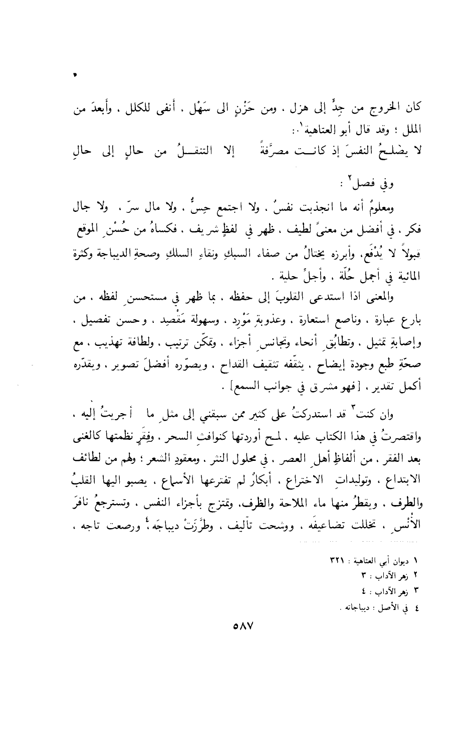 وهذا التصنيف لا تدرك غايته، ولا تبلغ نهايته، إذ المعاني غير محصورة بعدد، ولا مقصورة إلى أمد، وقد أبرزت في الصدر، صحيفة العذر، يجول فرندها، ويثقب زندها، ومن ركب مطية الاعتذار، واجتنب خطية الإصرار، فقد خرج من تبعة التقصير، وبرز من عهدة المعاذير، وإن أحق ما احتكم إليه، واقتصر عليه، الاعتراف بفضل الإنصاف، فليعلم من ينصف أن الاختبار ليس يعلم ضرورةً، ولا يوقف له على صورة، فليكثر الإغماض، وليقل الاعتراض، ولو وقع الإجماع على ما يرضي ويسخط، ويثبت ويسقط، لارتفع حجاج المختلفين في أمر الدنيا والدين.