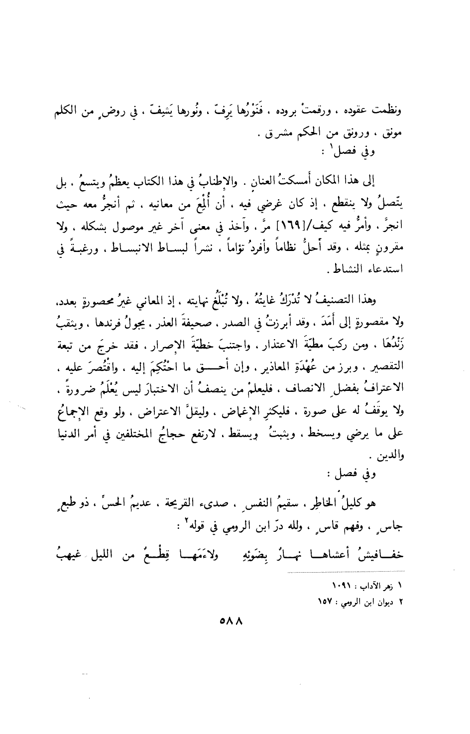فهو كما قال الخوارزمي: قد أسكرته خمرة الكبر، واستهوته غرة التيه، فخيل إليه أن كسرى حامل غاشيته، وقارون وكيل نفقته، وبلقيس إحدى داياته، وأن الشمس تطلع من جبينه، والغمام يندى من عينه، فهو يرى ببصر جهله لا ببصيرة عقله، وأن امرأ القيس ما بكى بالديار وعرصاتها، ولا اغتدى والطير في وكناتها، ولا أحسن تقصيد القصائد، وتقييد الأوابد، وأن زياداً (3) لم توقد باليفاع ناره، ولا أعتب النعمان اعتذاره، وأن شعره لم يرق حتى يقال: الماء أو أسلس، ويجزل حتى يقال: الصخر أو أملس، وأن زهيراً كان متعاظل الكلام، متداخل الأقسام، غير مطبقٍ للمفاصل، ولا مصيبٍ للشواكل، وأما طبقات المخضرمين من الإسلاميين فلا يضربون إليه بقدح، ولا يفوزون عنده بنجحٍ.
