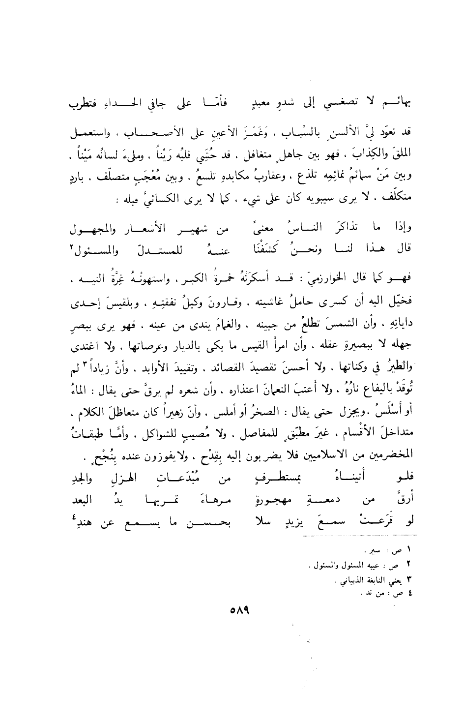 قد تقاربت الصفات، وتوازنت الذوات، وتكاشفنا لما تعارفنا، ورفعت الخلوة حجاب الاحتجاب، وحطت الخلطة لثام الاكتتام، وكنا مع طول الامتحان والاختبار، ومدة الالتباس والاحتيار، نقنع من ارتفاع القناع بلمحة، ومن اتقاد الزناد بقدحة، ونبرز العبارات، من معارض الإشارات، وغوامض الاستعارات، في طراز من الأرماز يدق عن مسرى السحر، ويرق عن مجرى الخمر: